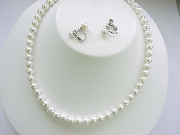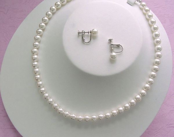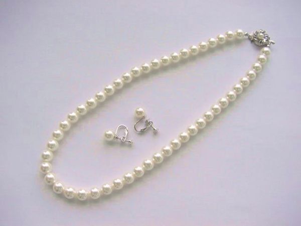 ◆素材 : 貝パール 8mm珠(ホワイト) ◆本体材質 : クラスプ・イヤリング金具の材質 : 真鍮(ロジュウム仕上) ◆サイズ : 長さ=約43cm ◆イヤリング:スクリュー式(スプリング付) |