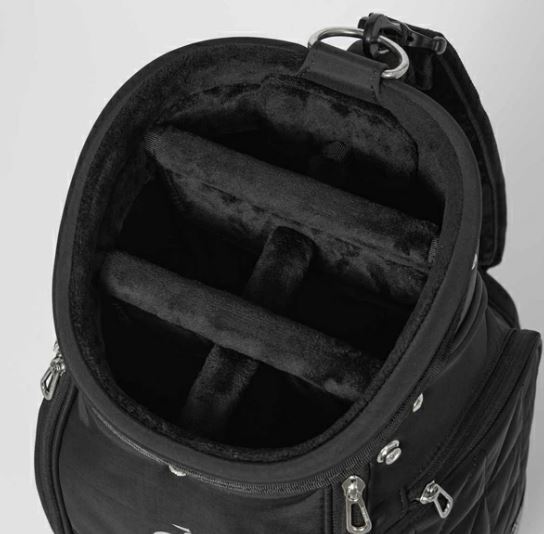 サイドやボトムには、ブランドロゴがジャガードテープで施されており、シ ョルダーやセパレートはボア素材を用いた高級感のあるキャディバッグ。