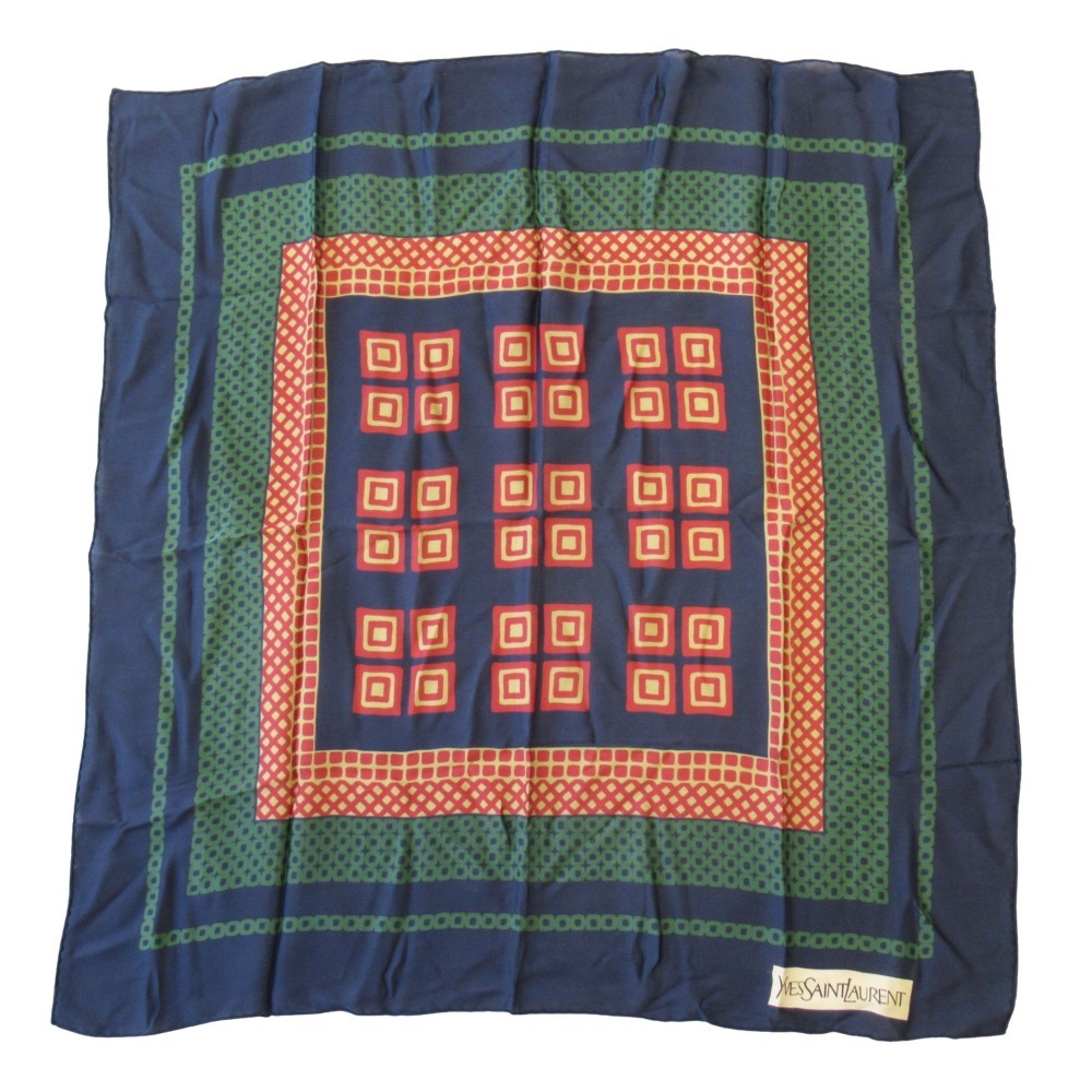 YVES SAINT LAURENT イヴサンローラン シルク 総柄 大判 スカーフ ショール ヴィンテージ ビンテージ ネイビー/マルチ