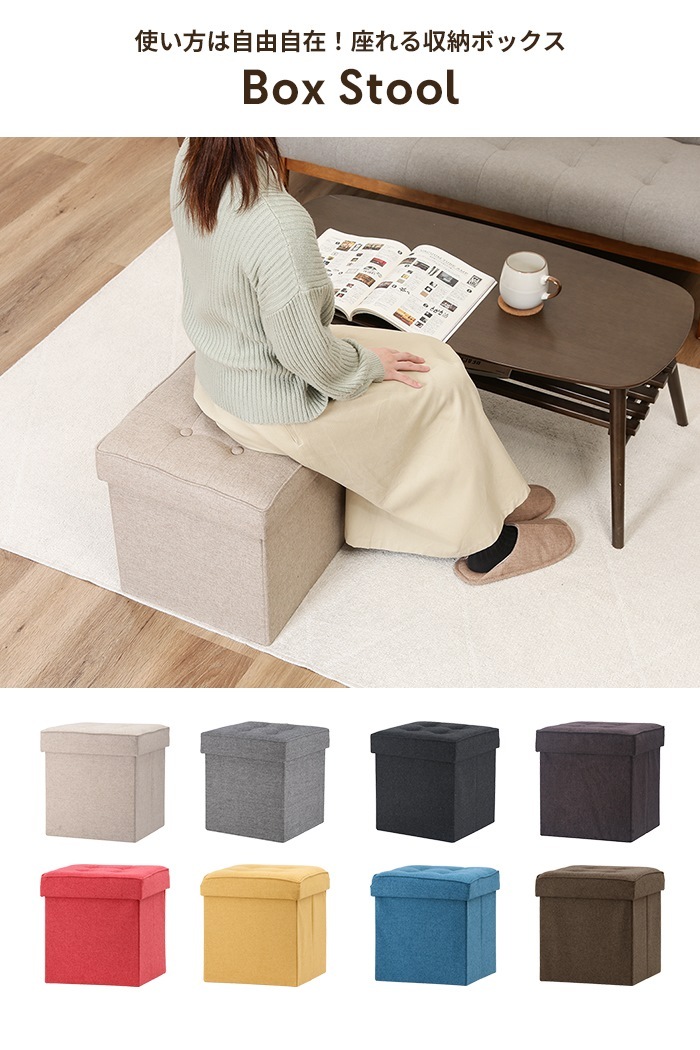 | 座れる収納ボックス。 座面下はたっぷり収納できる収納スペースになっています。 スツールとしてはもちろん、オットマンとしても◎ 使わないときは折りたためるので、場所を取りません。 さらっとした触り心地のファブリックを使用しているので、年中快適にお使いいただけます。 空間に馴染みやすいシンプルなデザインとカラー展開。 さまざまな場所で活躍するスツールです。 |
