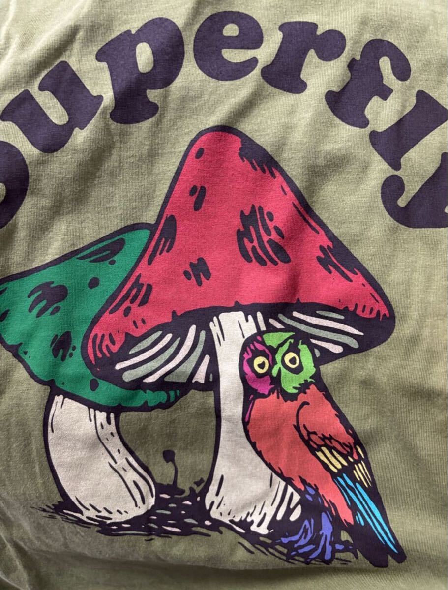 独特のレトロポップな世界観が印象的な、SuperflyとDALUCによるコラボTシャツのご紹介です。目を引くのは、緑をベースにしたボディに大胆にあしらわれたキノコとフクロウのアートワーク。サイケでポップな配色、まるで70年代のロックアートを彷彿とさせるグラフィックは、ただのTシャツではありません。ファッションとしての個性とアートピースとしての魅力を兼ね備えた、まさに一点もののような存在感。