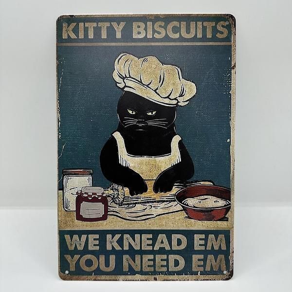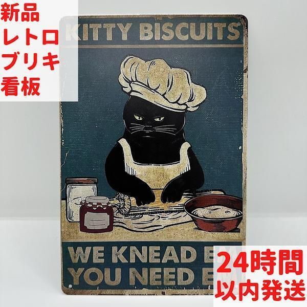 このブリキ看板は、黒猫がビスケットをこねているユーモラスなデザインが特徴です。