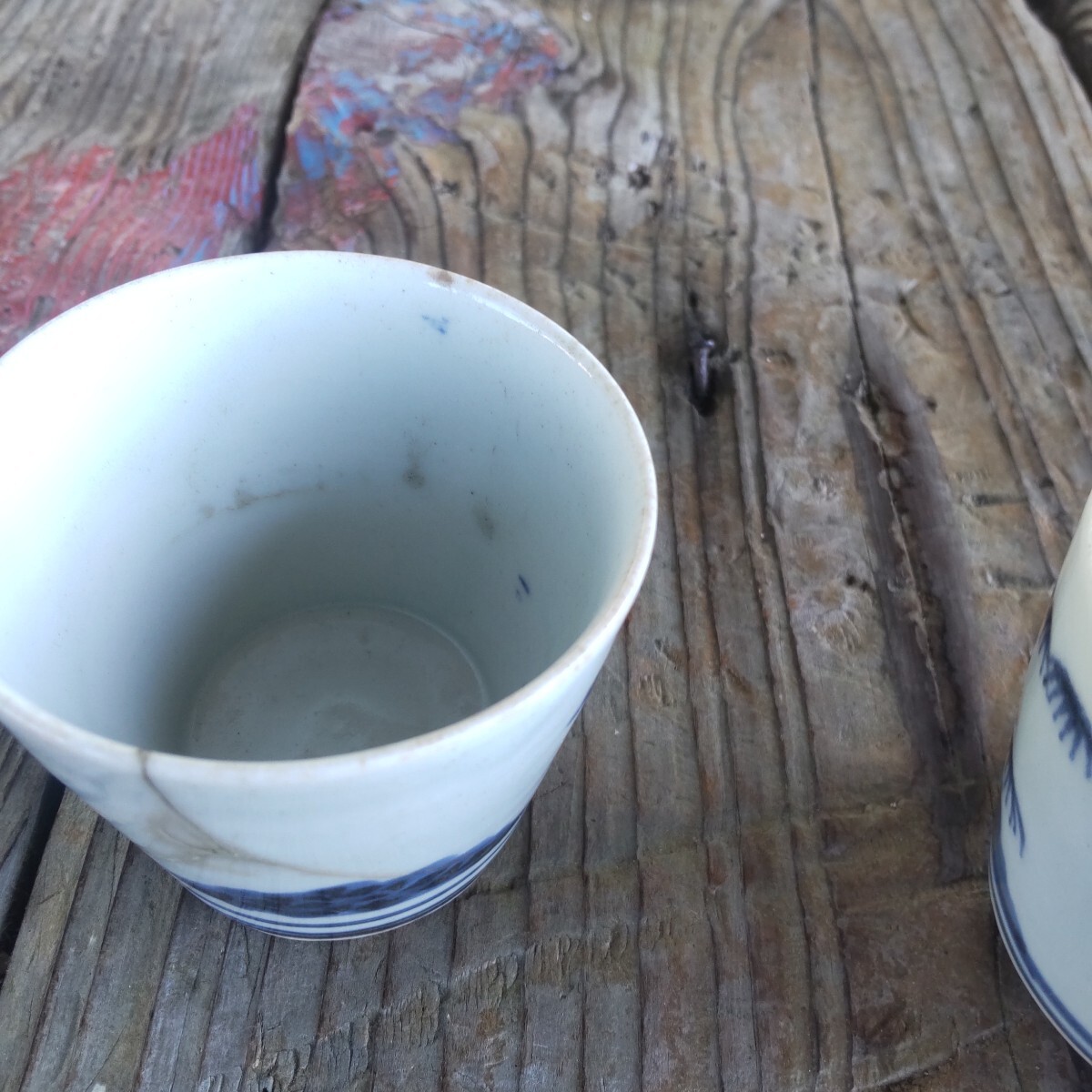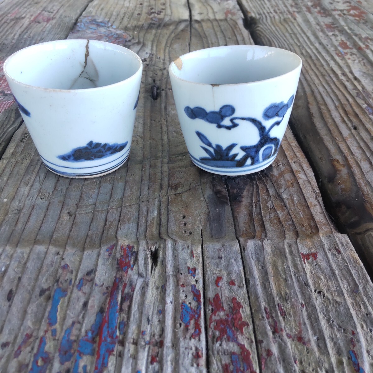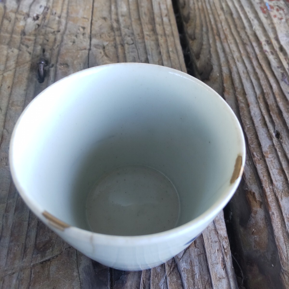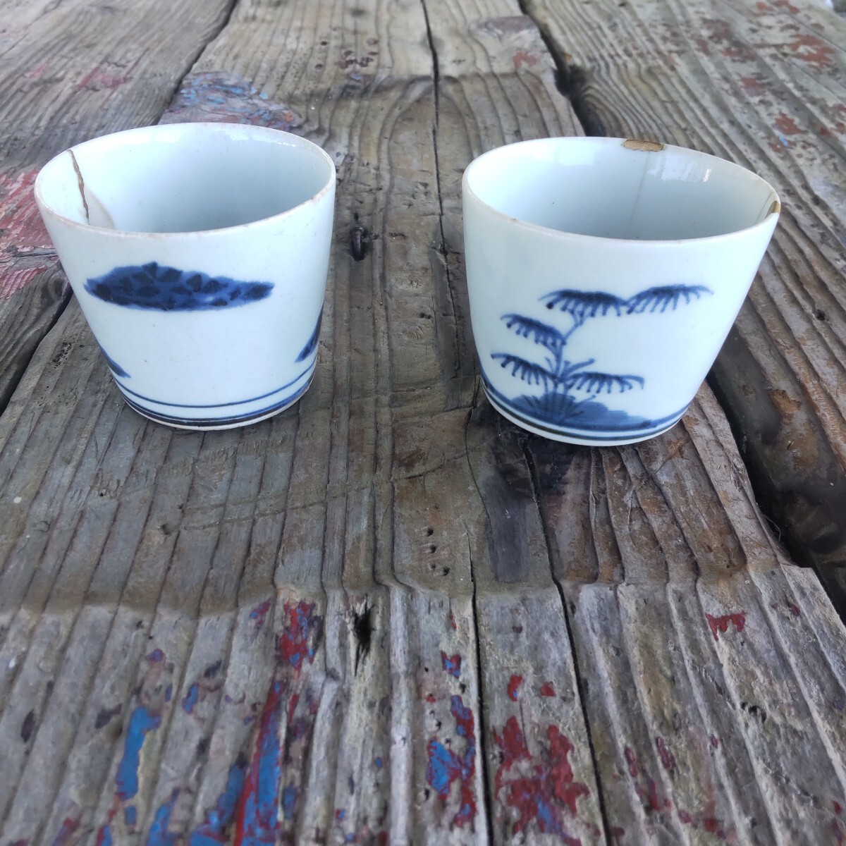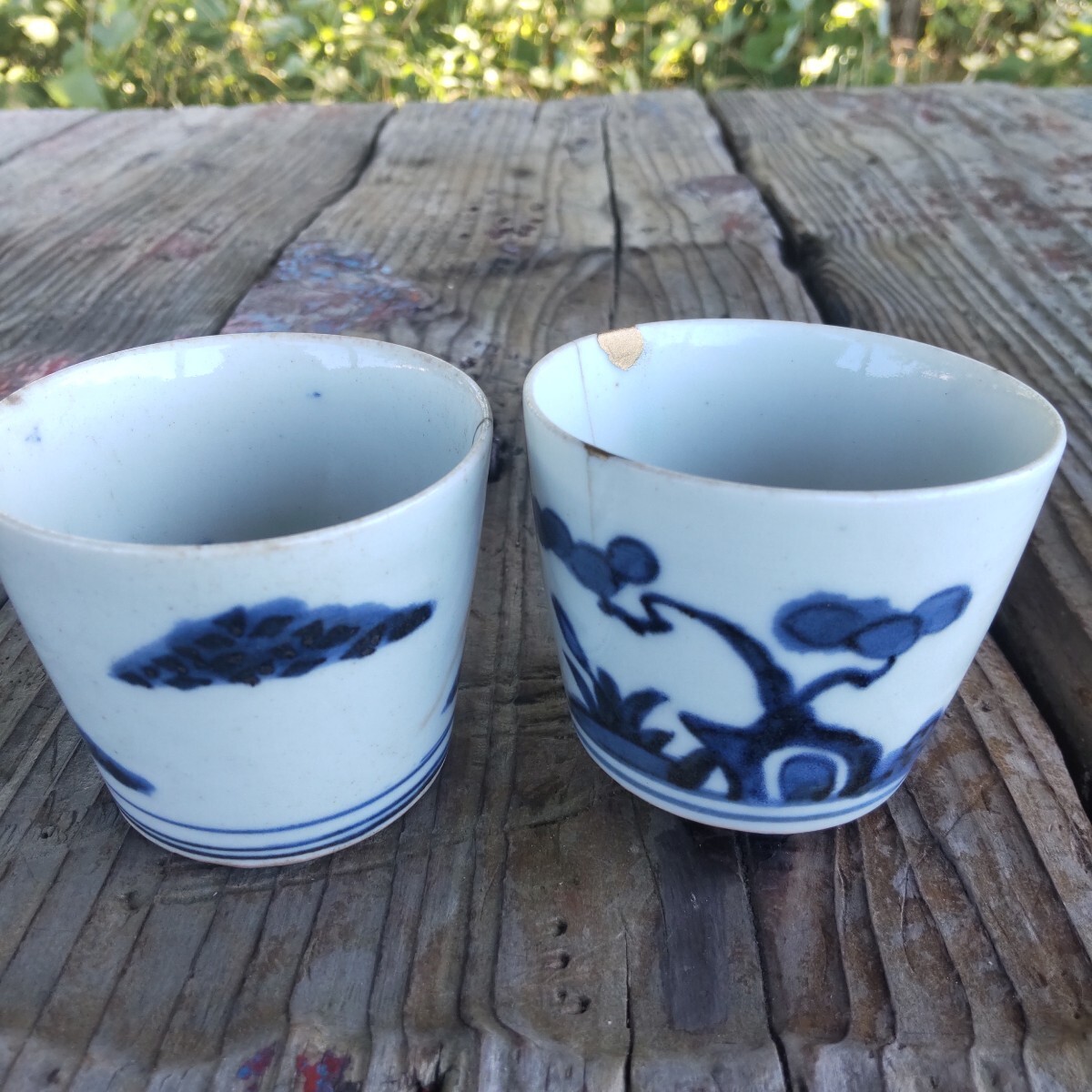 江戸時代幕末の蕎麦猪口染め付けです。漏れ欠けは、ありませんが、残念ながら、両方とも、欠け割れがあり(直し有り)。左はガラス継ぎ江戸時代流行ったらしいです。右の直しは、金彩です。柄は松(写真1)と菊(写真4)です。(内側写真9)当方知識が有りません。お好きな方インテリアに。日常使いに。