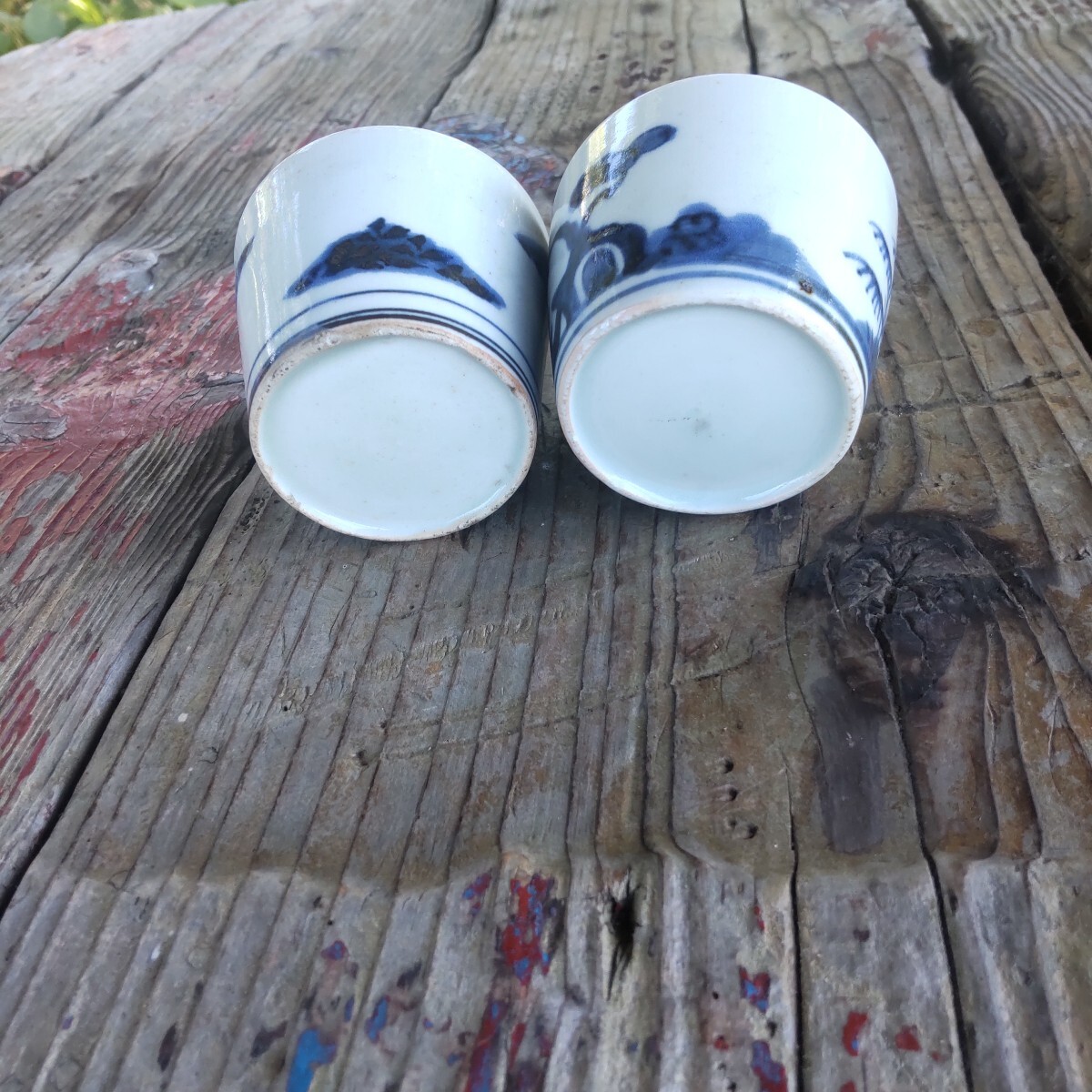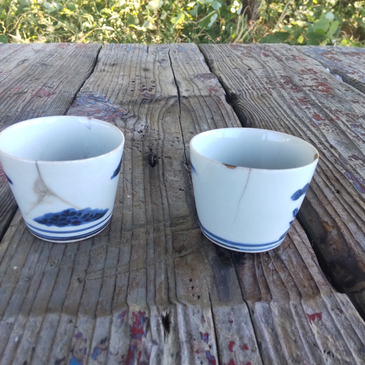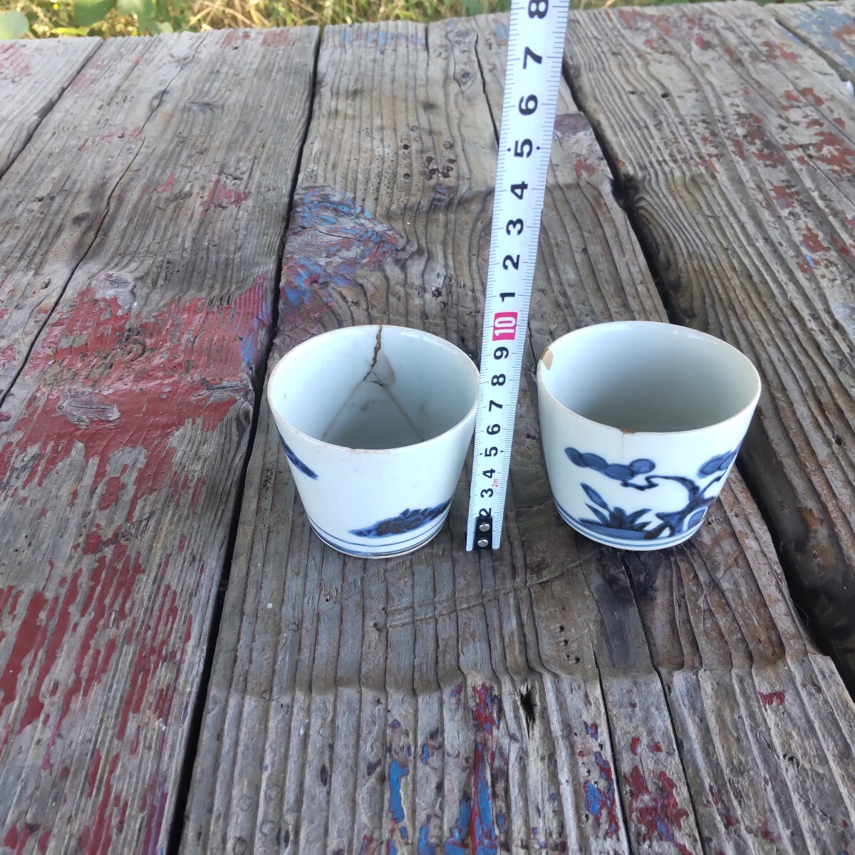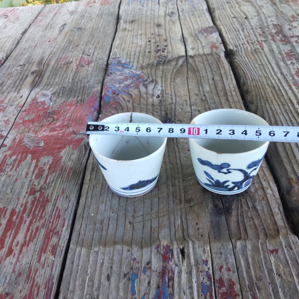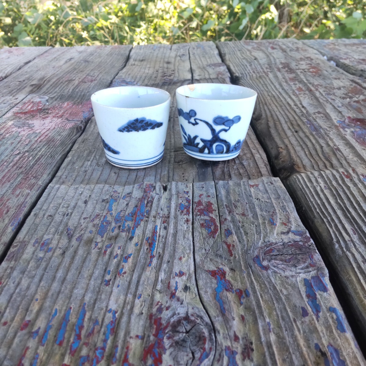 江戸時代幕末の蕎麦猪口染め付けです。漏れ欠けは、ありませんが、残念ながら、両方とも、欠け割れがあり(直し有り)。左はガラス継ぎ江戸時代流行ったらしいです。右の直しは、金彩です。柄は松(写真1)と菊(写真4)です。(内側写真9)当方知識が有りません。お好きな方インテリアに。日常使いに。
