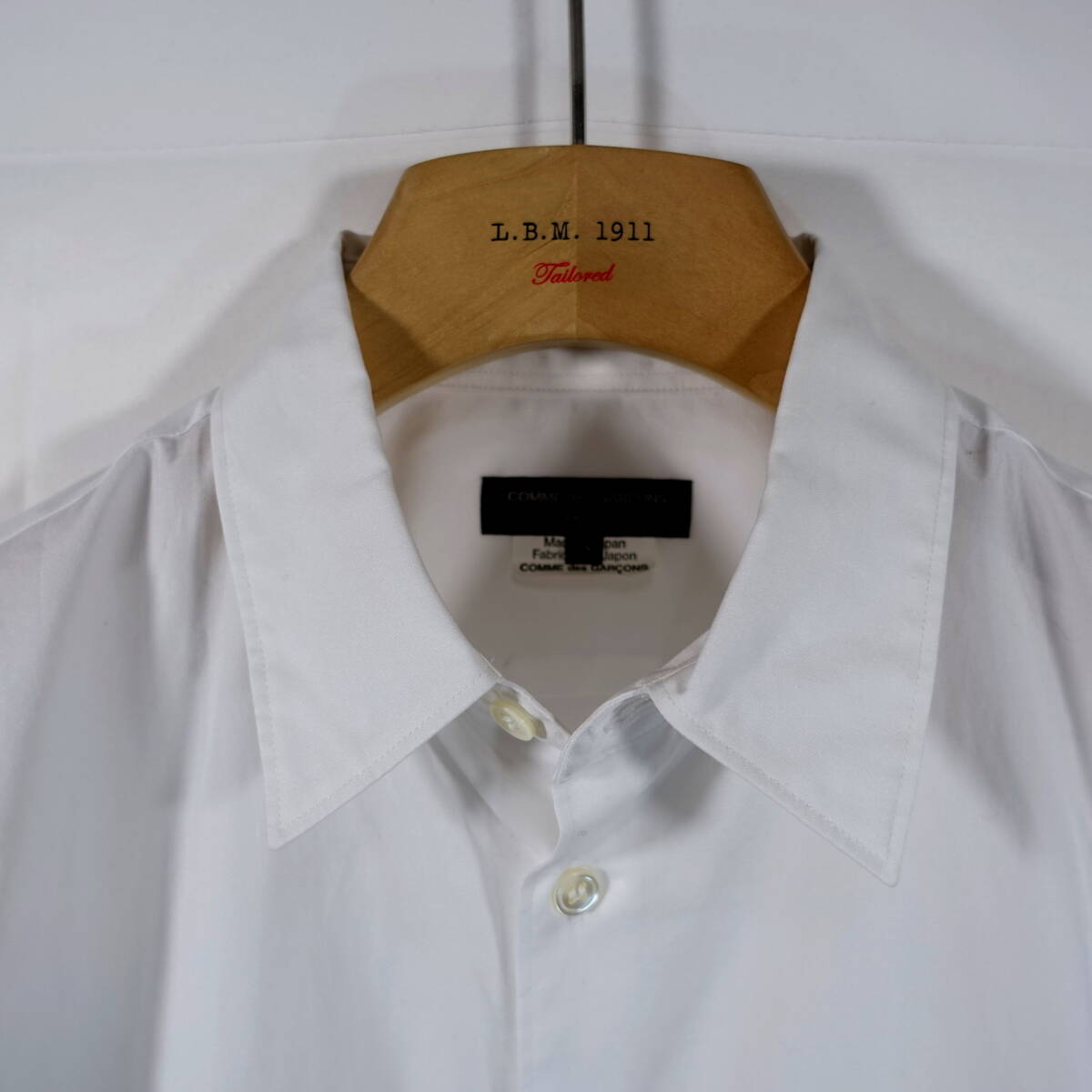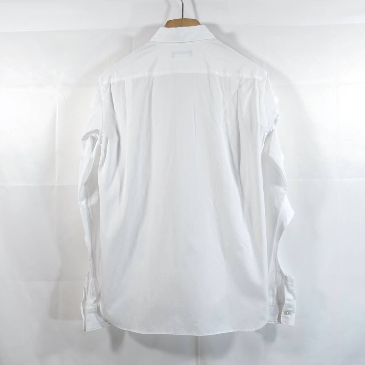 襟は小さめのレギュラーカラー、胸ポケット1つ、前立てなし、ボタンは白貝ボタンです。