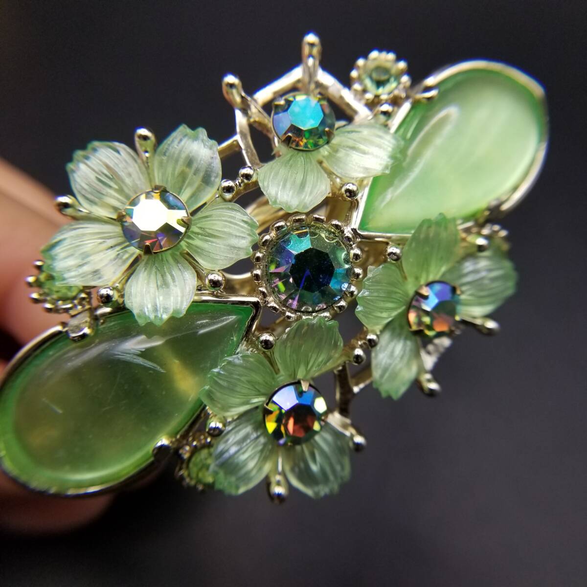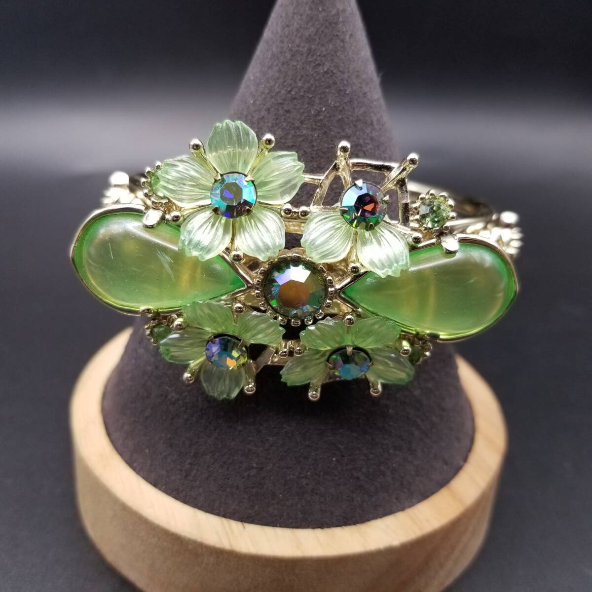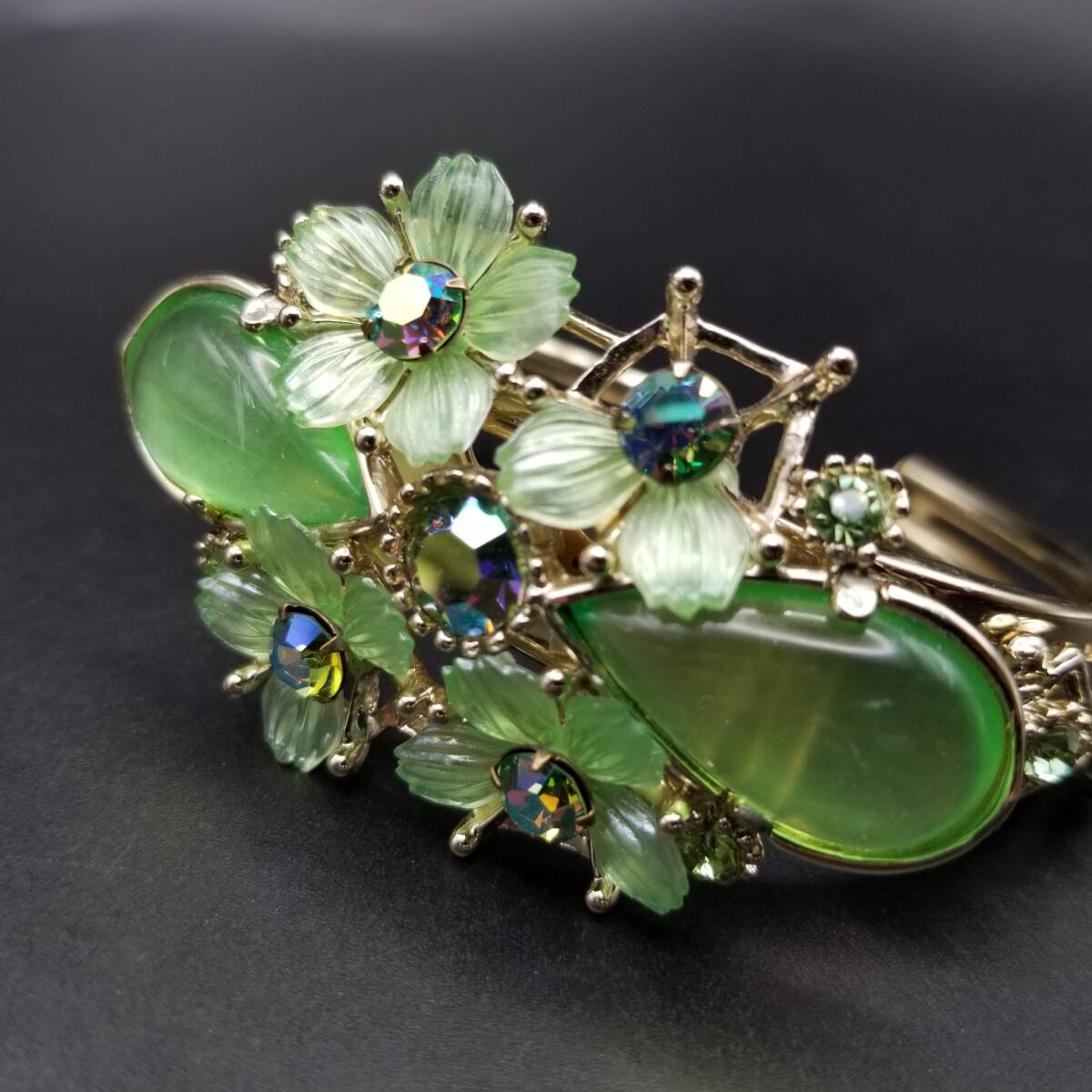50's Selro 鮮やかな黄緑の花 大ぶり ルーサイト ヴィンテージ カフ ブレスレット 華やか フェミニン ボタニカル セルロ・セリーニ R16-O