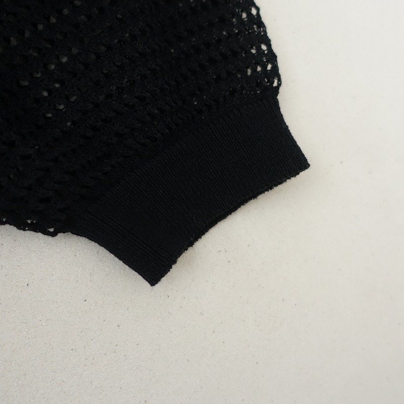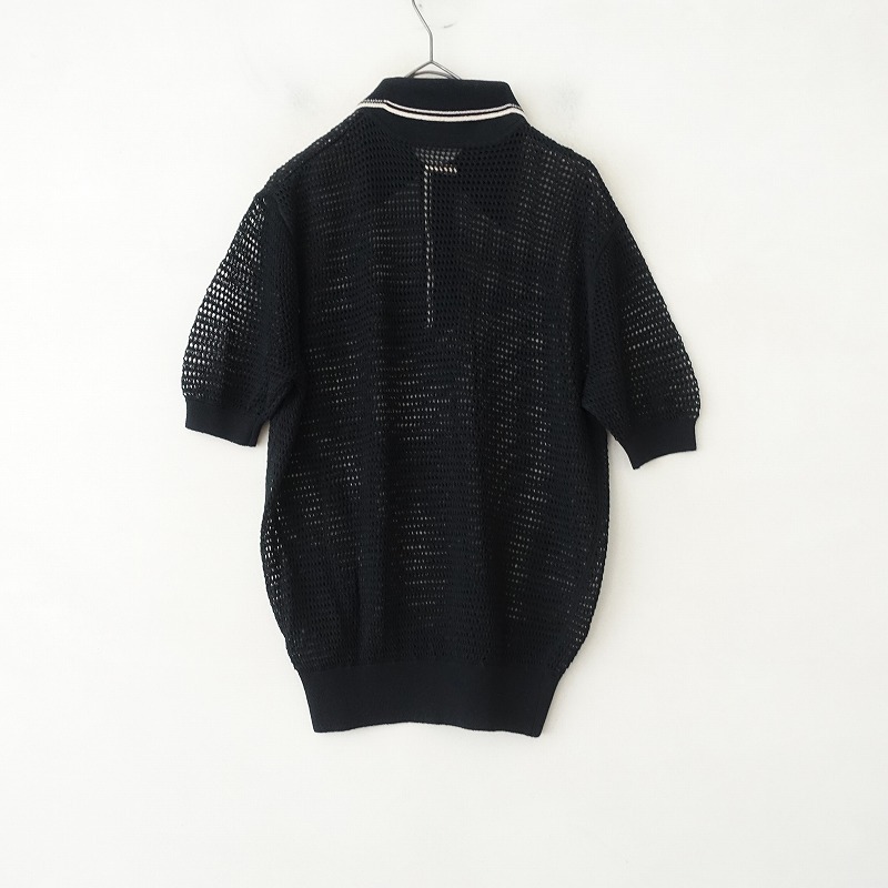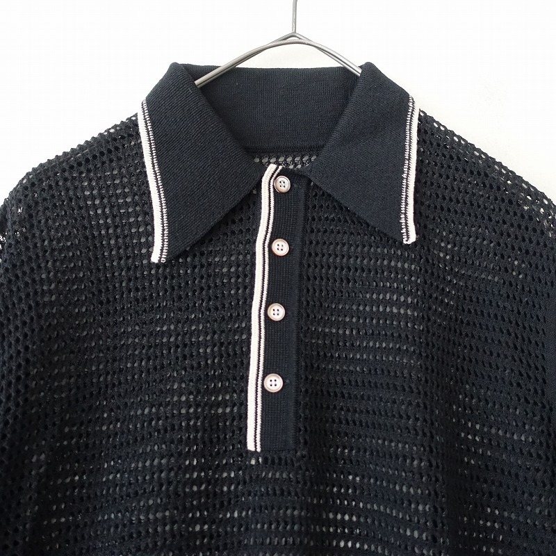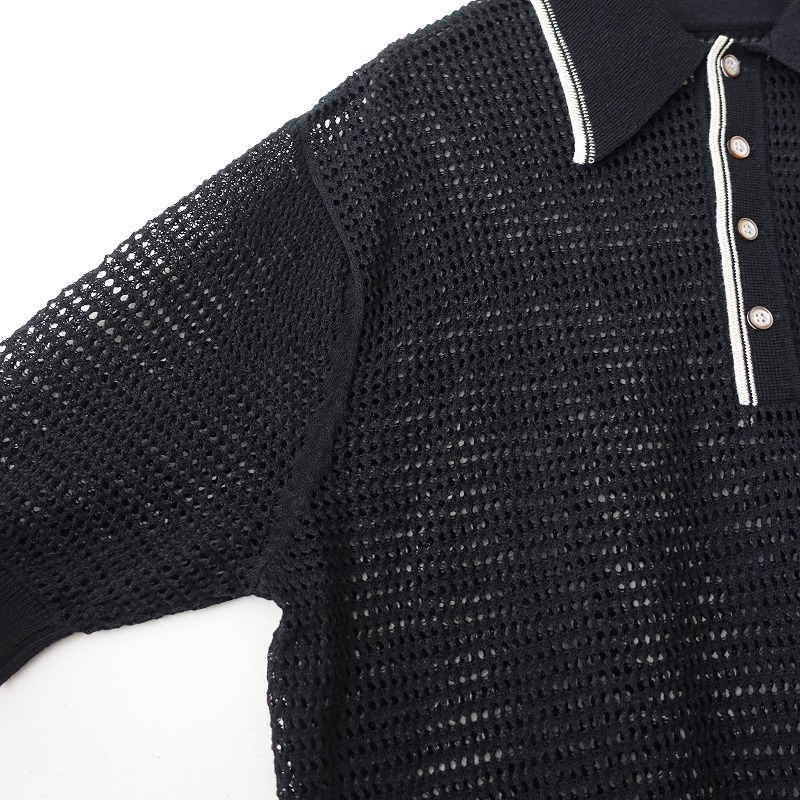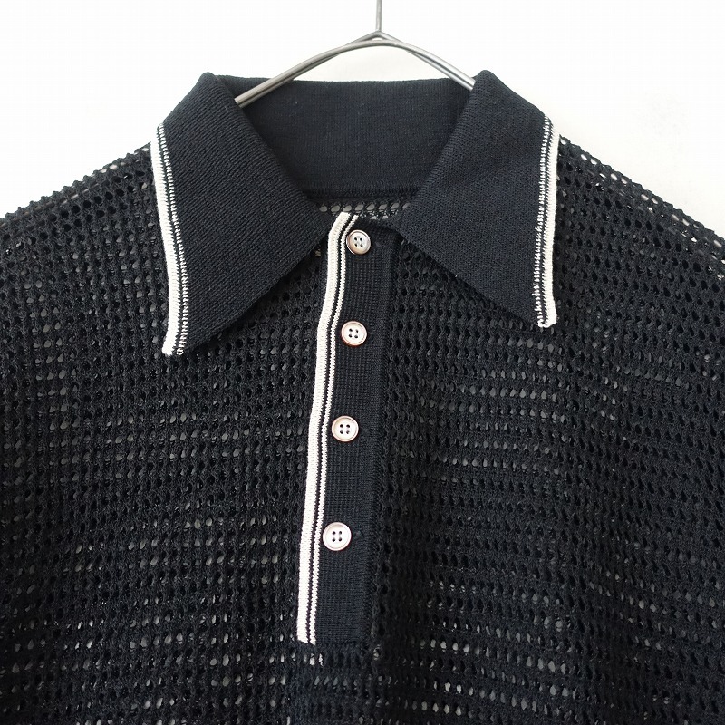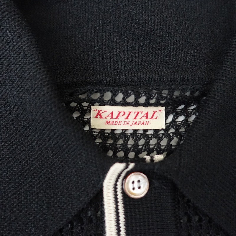 2024年コレクションKAPITALの12Gメッシュニットキャロルポロです。カラーはブラックで12Gのメッシュニット素材で仕立てられており、エクリュのライン入りです。襟元のボタン開閉のプルオーバータイプで、インが見えるデザインです。定価(メーカー希望小売価格)30,580円 税込みの商品です。 |