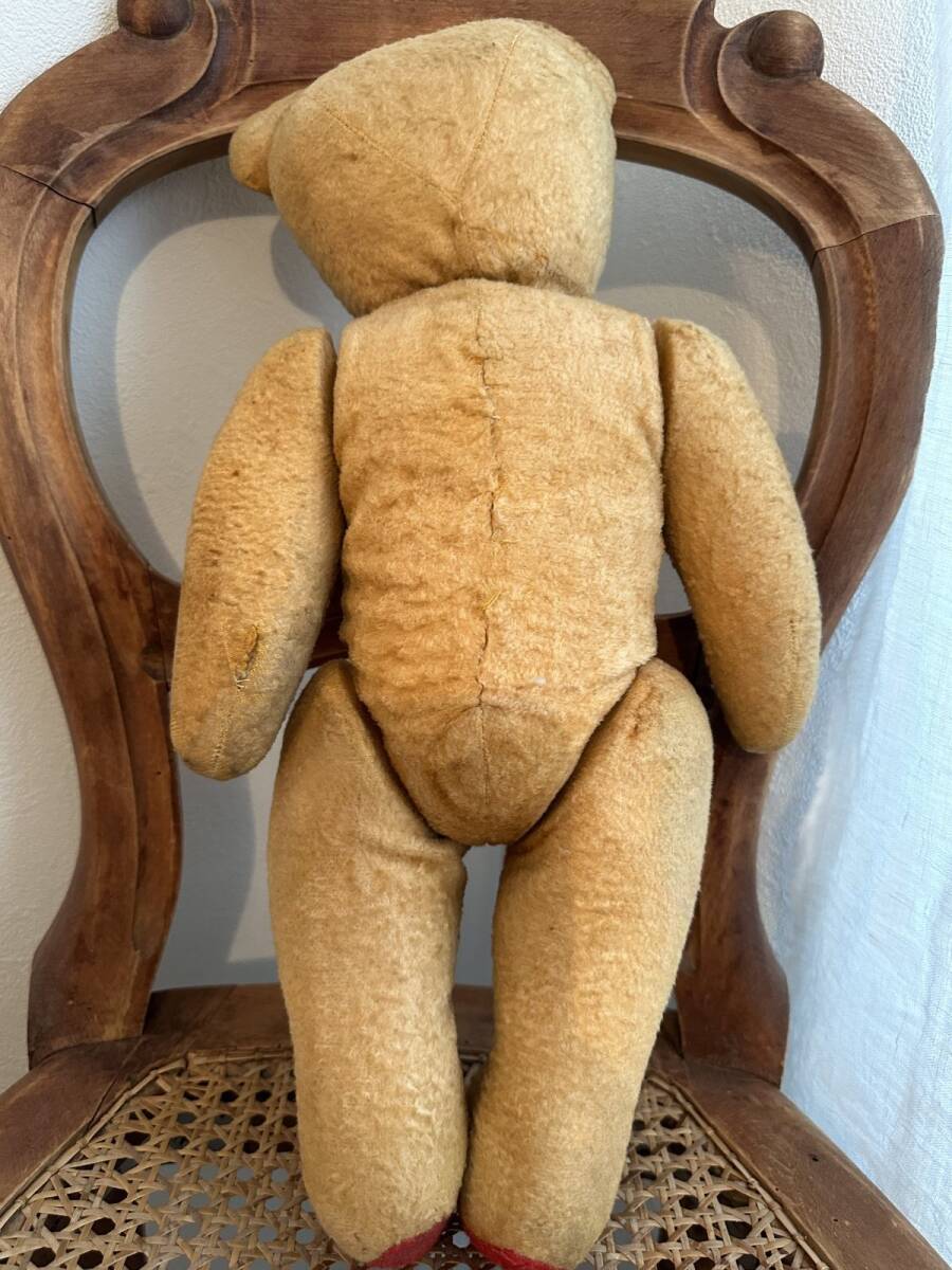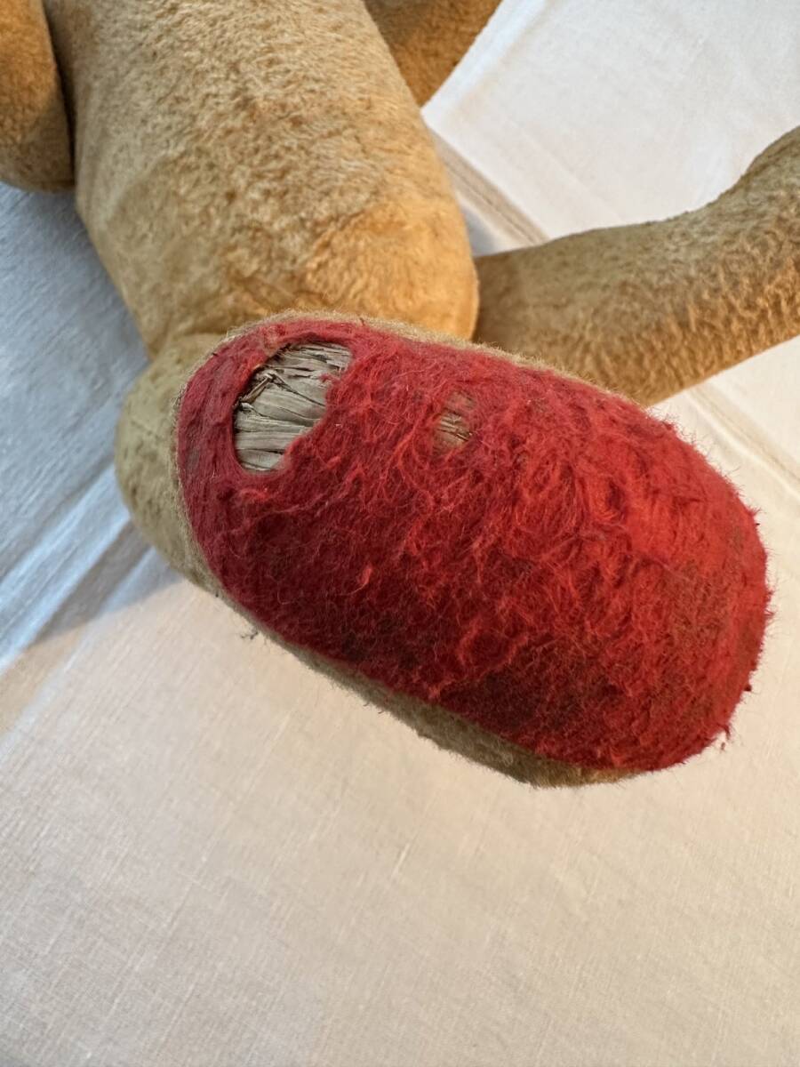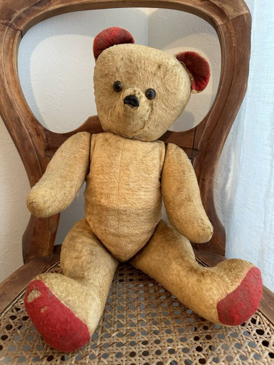 フランスで出会ったテディベア 赤い耳と足がとても可愛いです! 5ジョイントで全て稼働しますが両手両足が同時に稼働します。 画像にありますように腕に1箇所ほつれがあります。 足裏にもされて薄くなった部分があり 木毛が見えています! 画像にてご確認くださいませ。 ◆買い付け国◆ フランス ◆年代◆ 不明 ◆サイズ◆ 全長=約44cm |