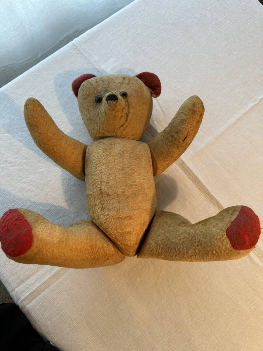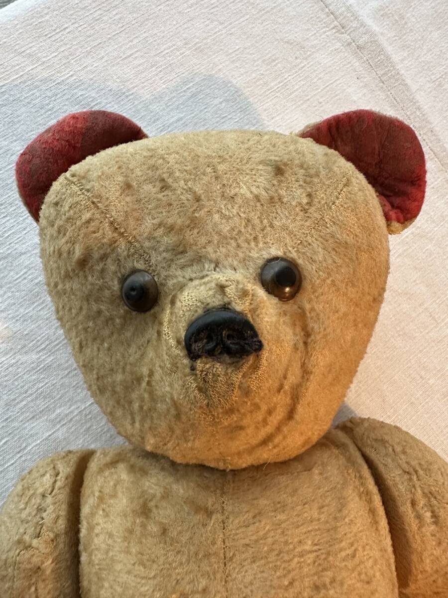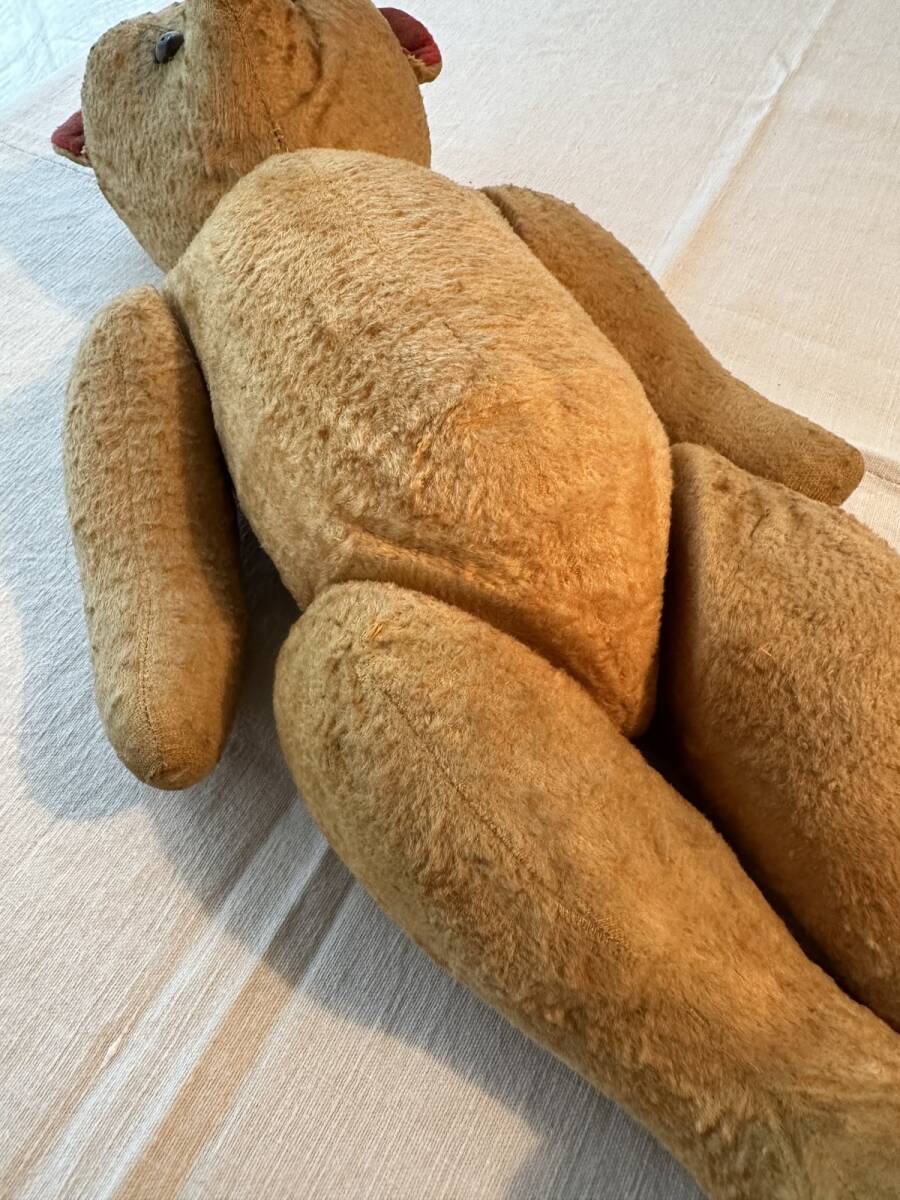 フランスで出会ったテディベア 赤い耳と足がとても可愛いです! 5ジョイントで全て稼働しますが両手両足が同時に稼働します。 画像にありますように腕に1箇所ほつれがあります。 足裏にもされて薄くなった部分があり 木毛が見えています! 画像にてご確認くださいませ。 ◆買い付け国◆ フランス ◆年代◆ 不明 ◆サイズ◆ 全長=約44cm |