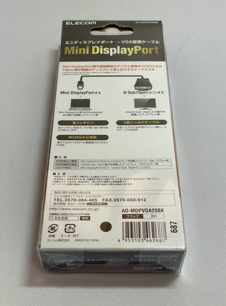 【未使用・未開封品】★ELECOM/エレコム:ミニディスプレイポート→VGA変換ケーブル/2m(AD-MDPVGA20BK)★