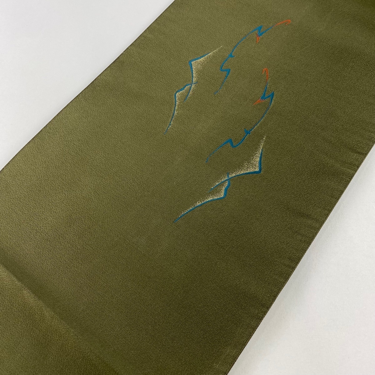 | 袋帯 美品 秀品 五条大橋 牛若丸と弁慶 箔 鶯色 お太鼓柄 正絹 【中古】 |
