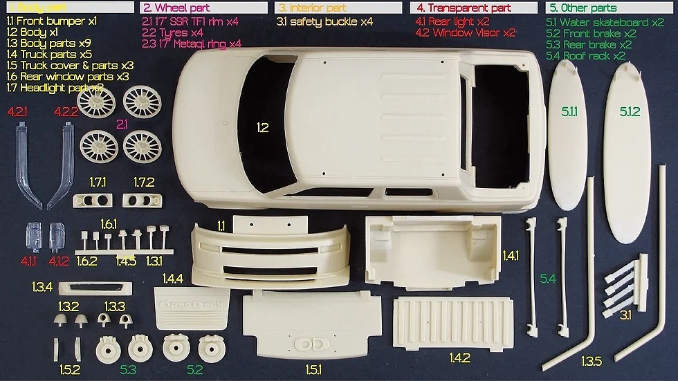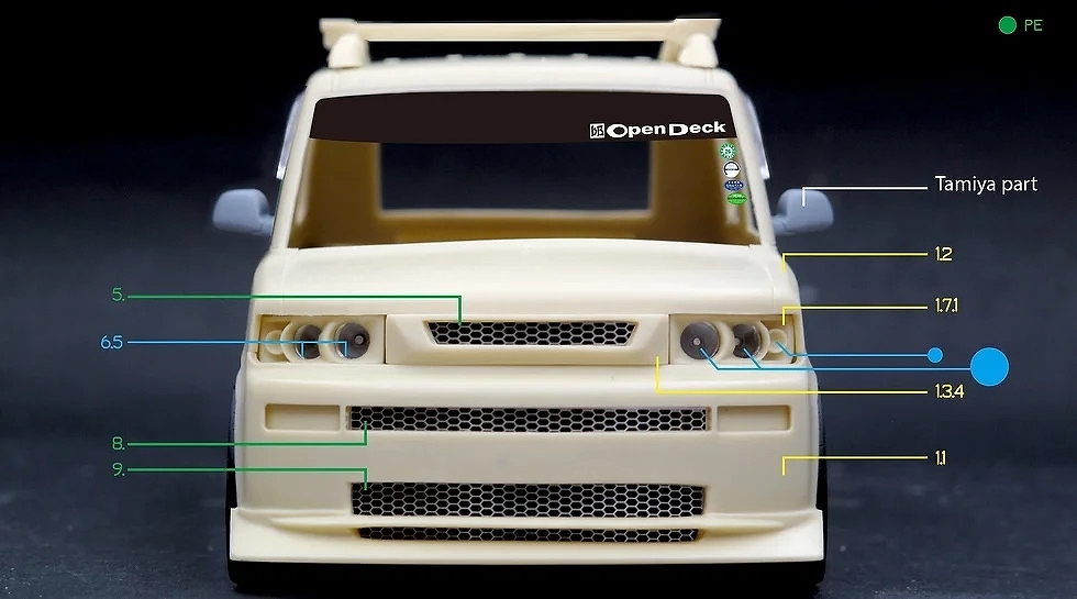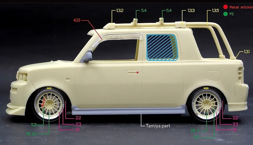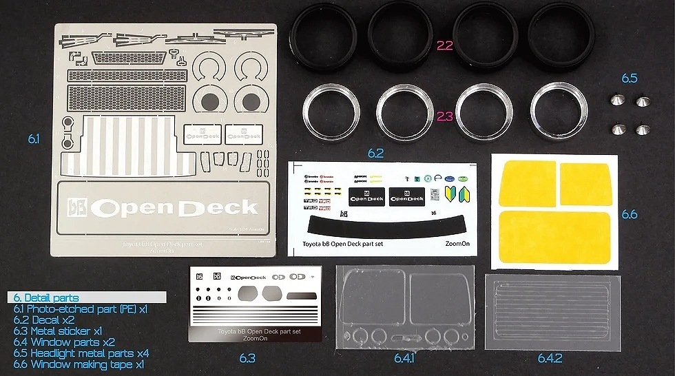 ZoomOn 1/24 Toyota bB Open Deck (NCP34) part set - Designed for Tamiya 1/24 kit. -- Total 45 Parts -- 1 set of decal -- 1 set of metal sticker -- 1 set of PE -- 1 set of metal parts -- 1 set of window masking tape -- 1 set of window parts