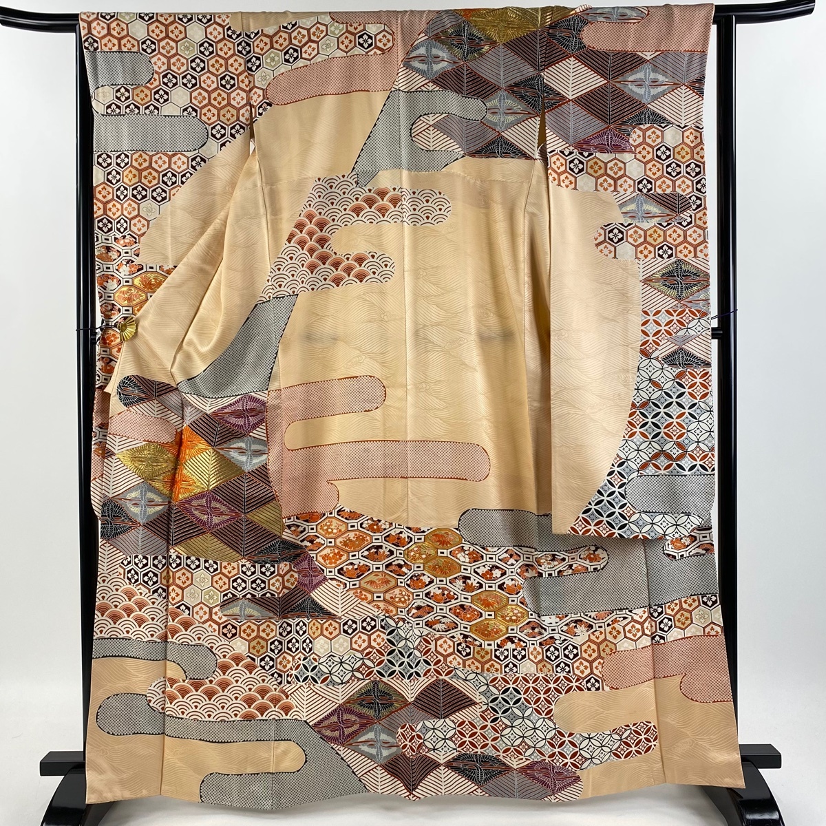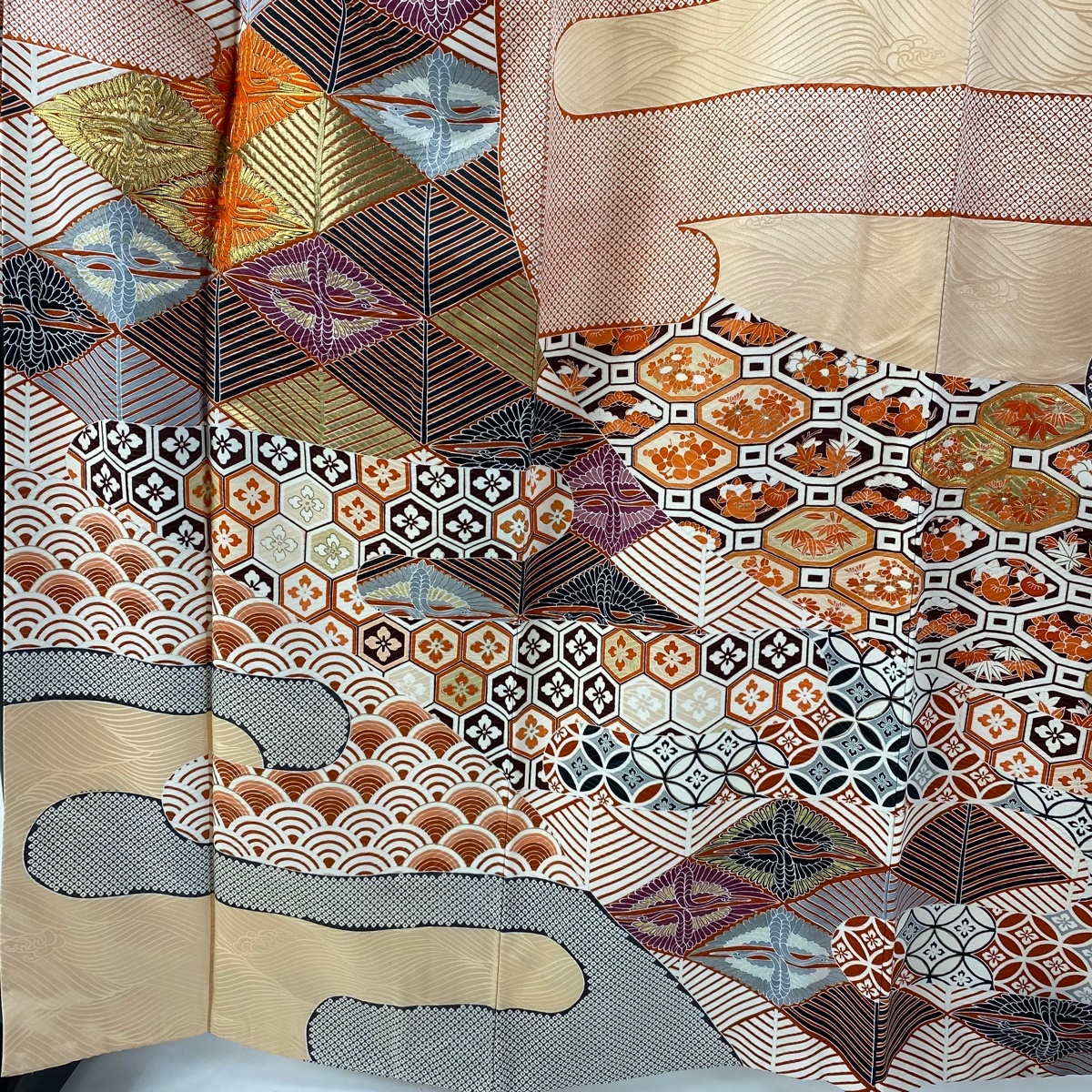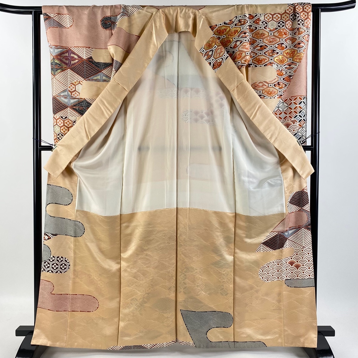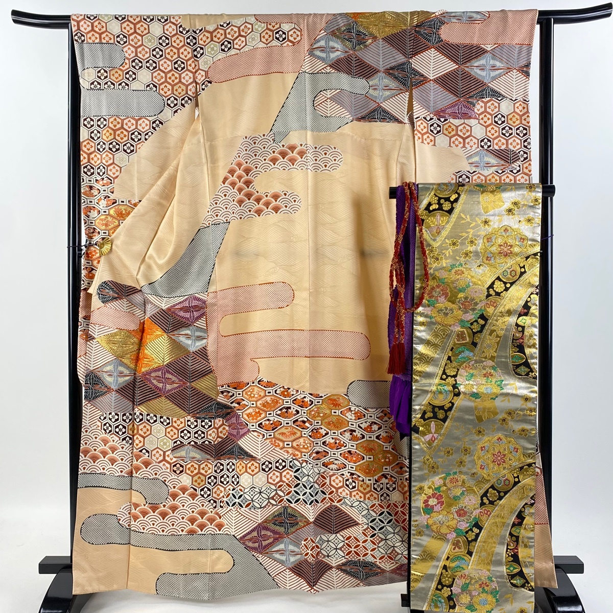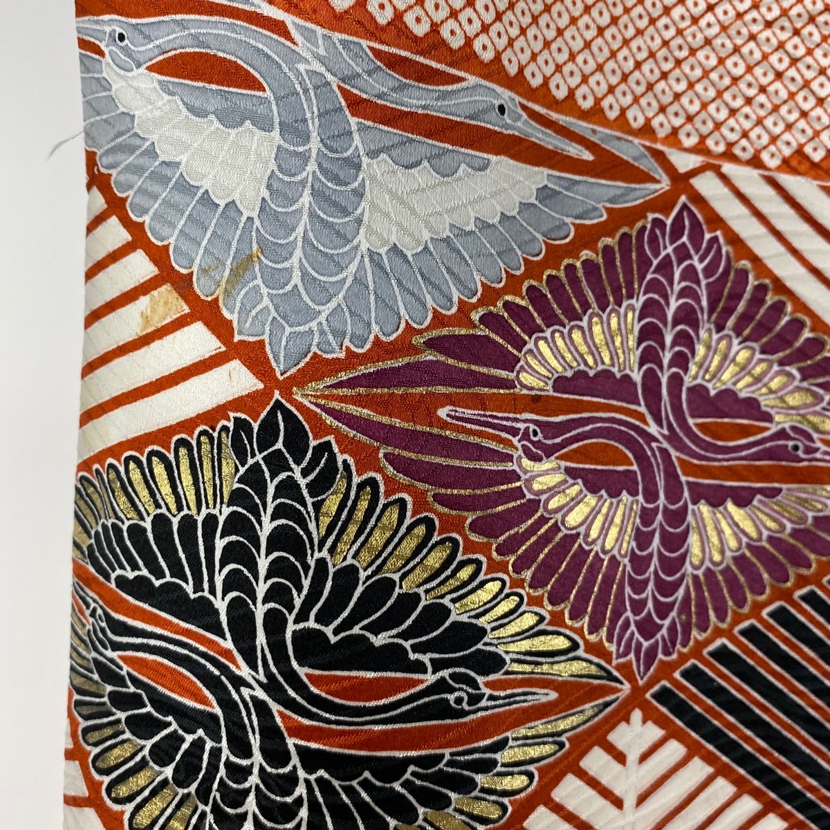 振袖 秀品 袋帯フルセット 向かい鶴 有職文様 金糸 刺繍 薄オレンジ 袷 身丈165 裄丈64.5 M 正絹 【中古】 |