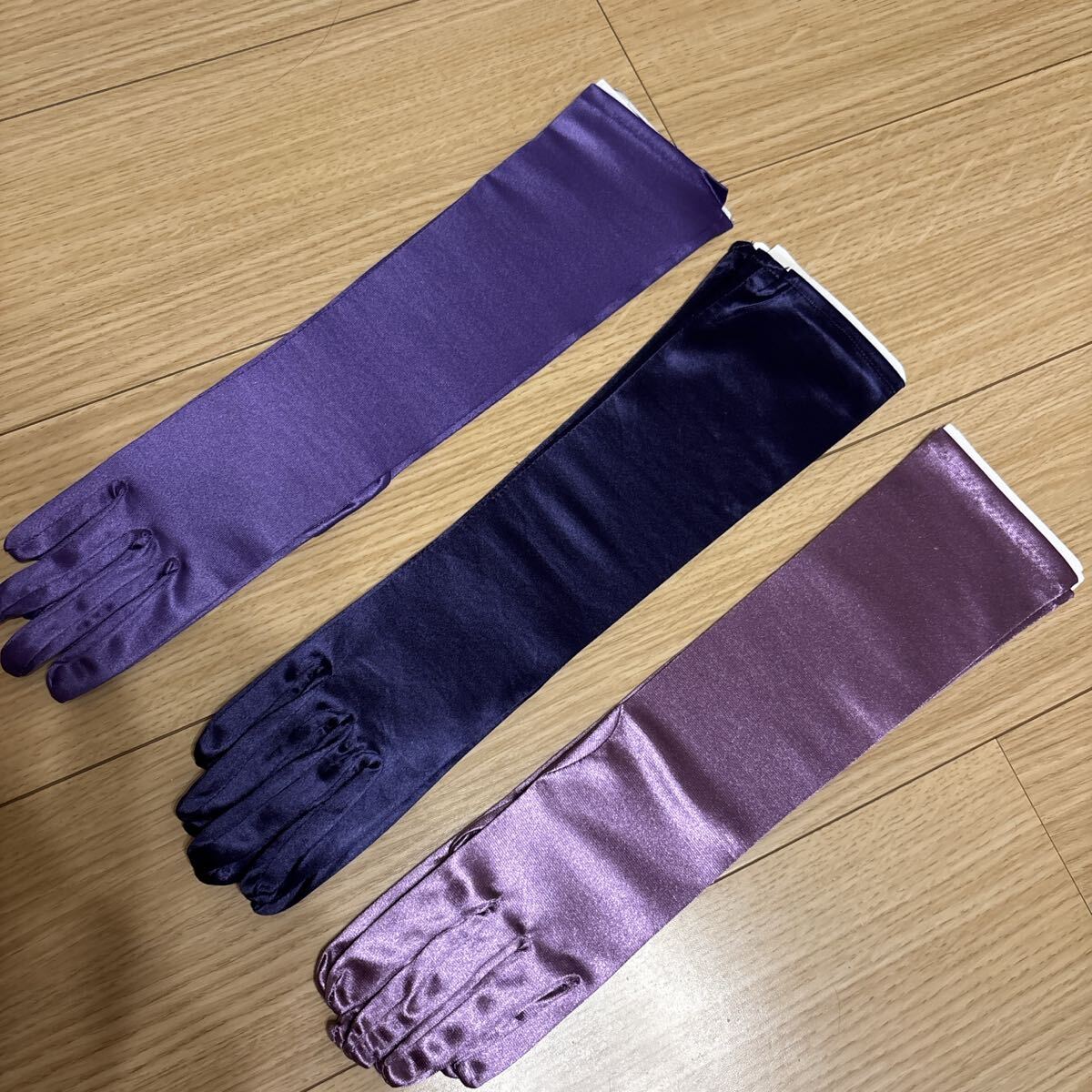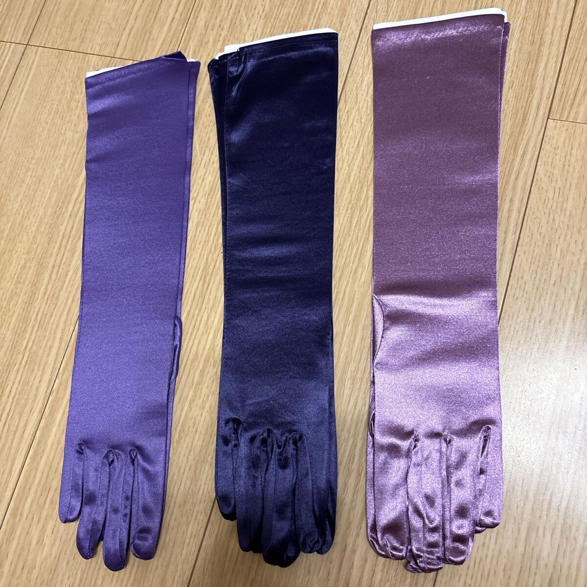 サテン風のロンググローブ3点セット、紫系の色合いが魅力。
