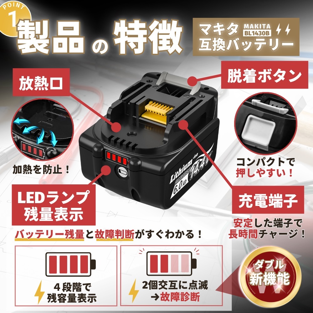 【互換品 BL1460B可能バッテリー】マキタ純正バッテリー 互換品 (ライトバッテリは対応しておりません)。BL1415 BL1430 BL1440 BL1450 BL1460 BL1430B BL1450B BL1460B 194065-3 194066-1 など。急速充電器DC18RFなど対応。