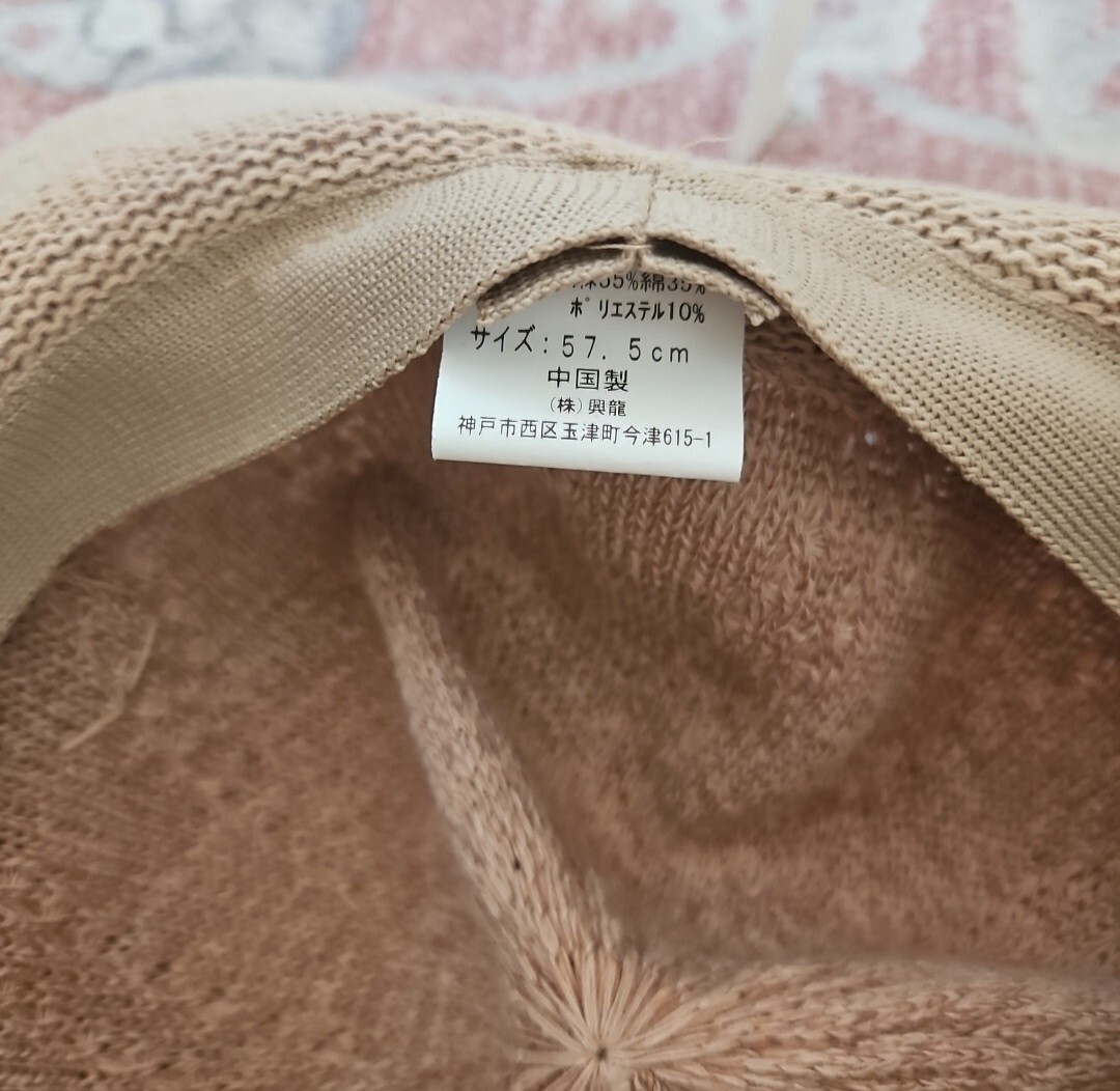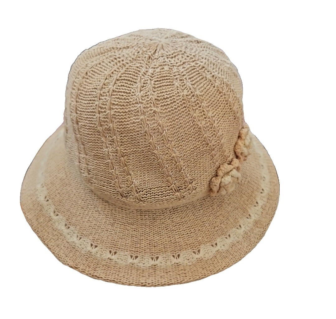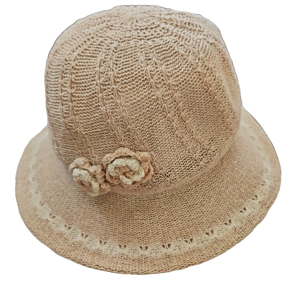 ベージュの編み物デザイン、フラワー装飾付きのカジュアルハット。