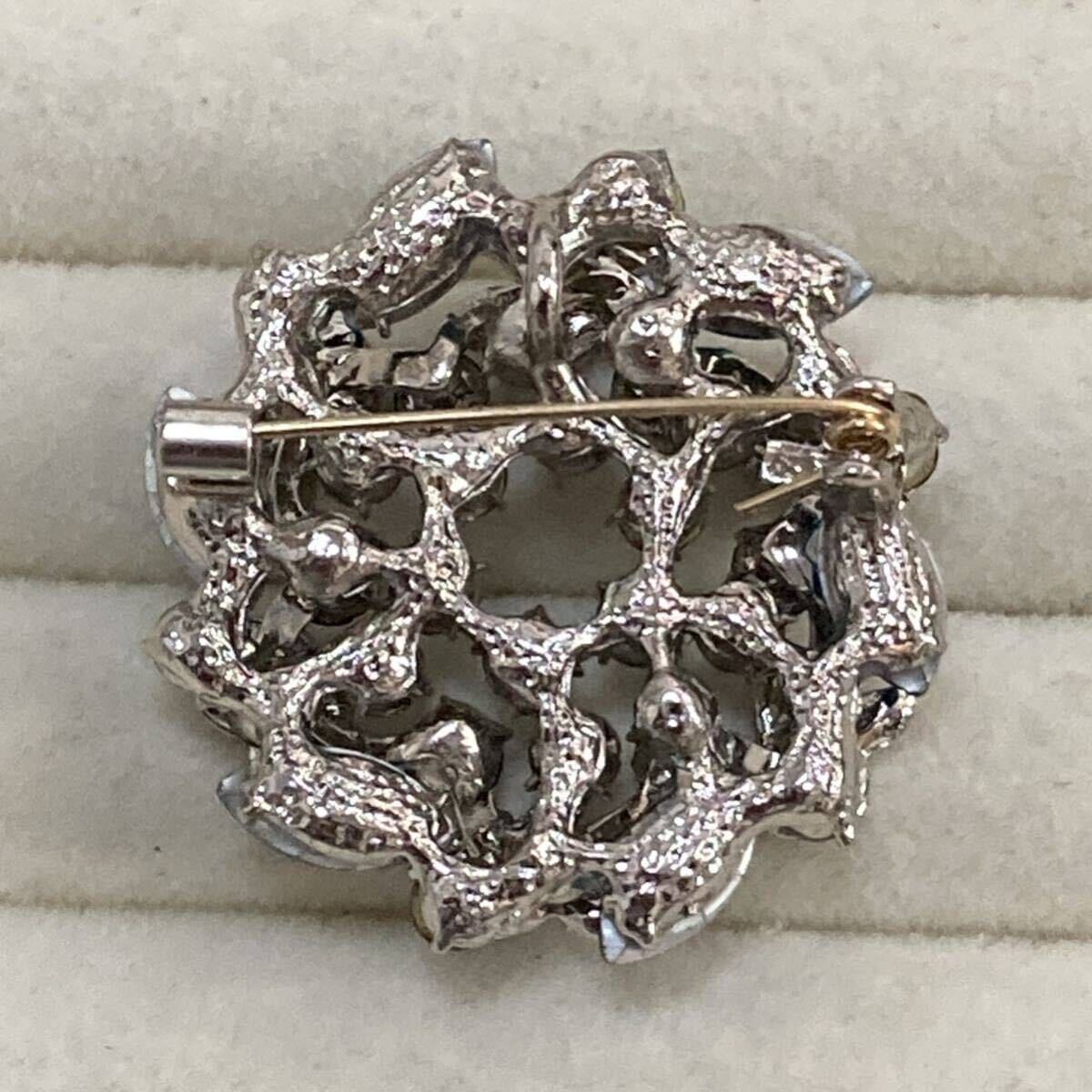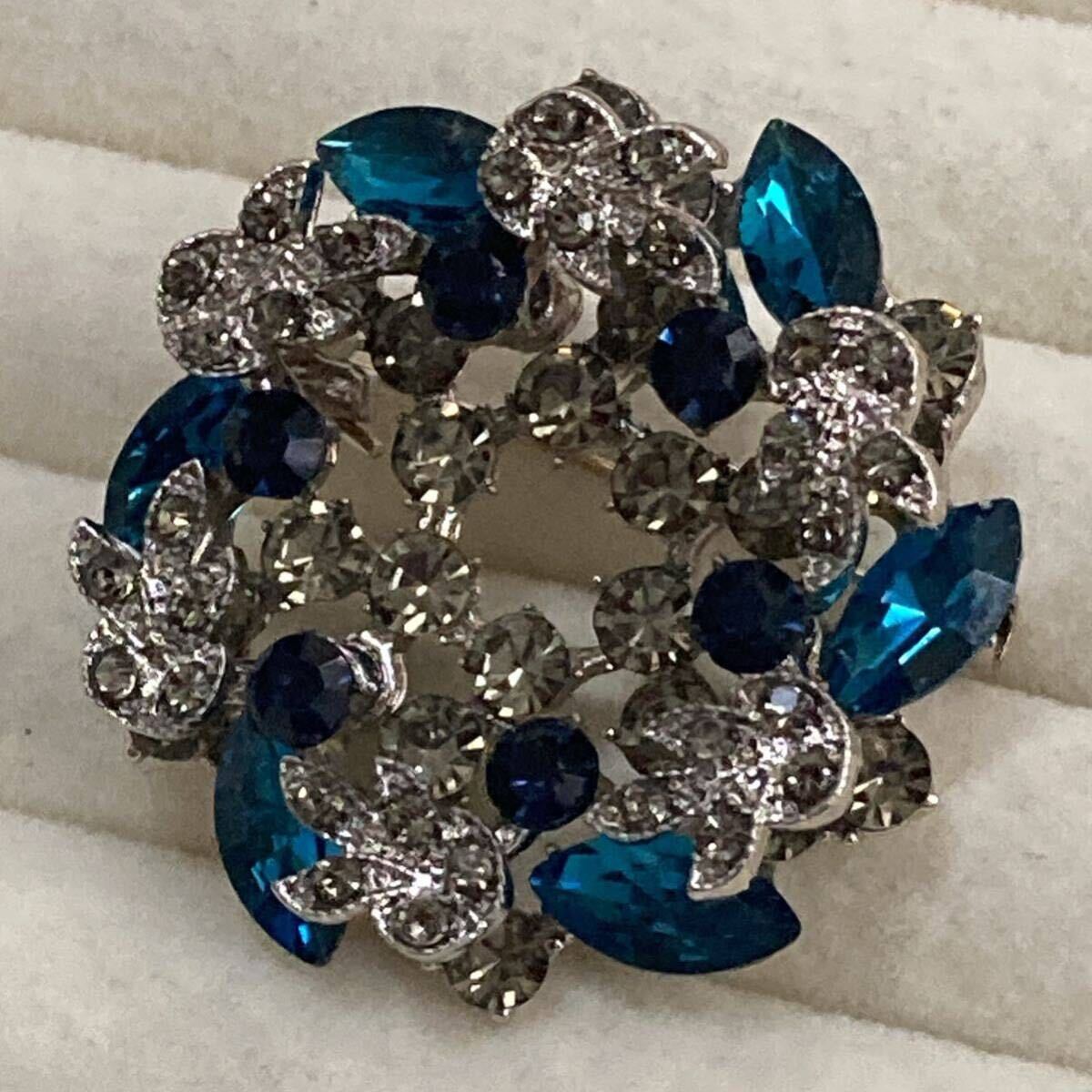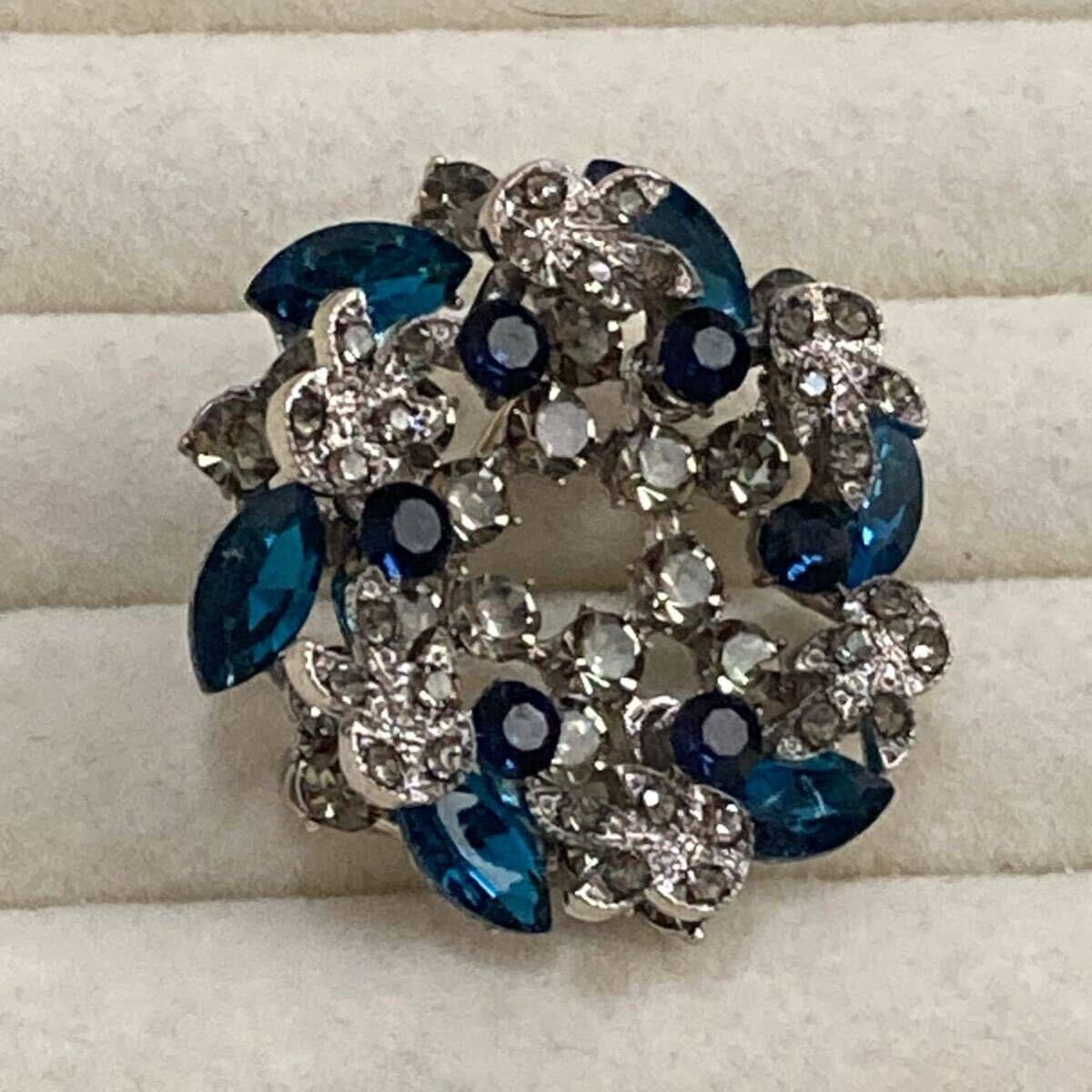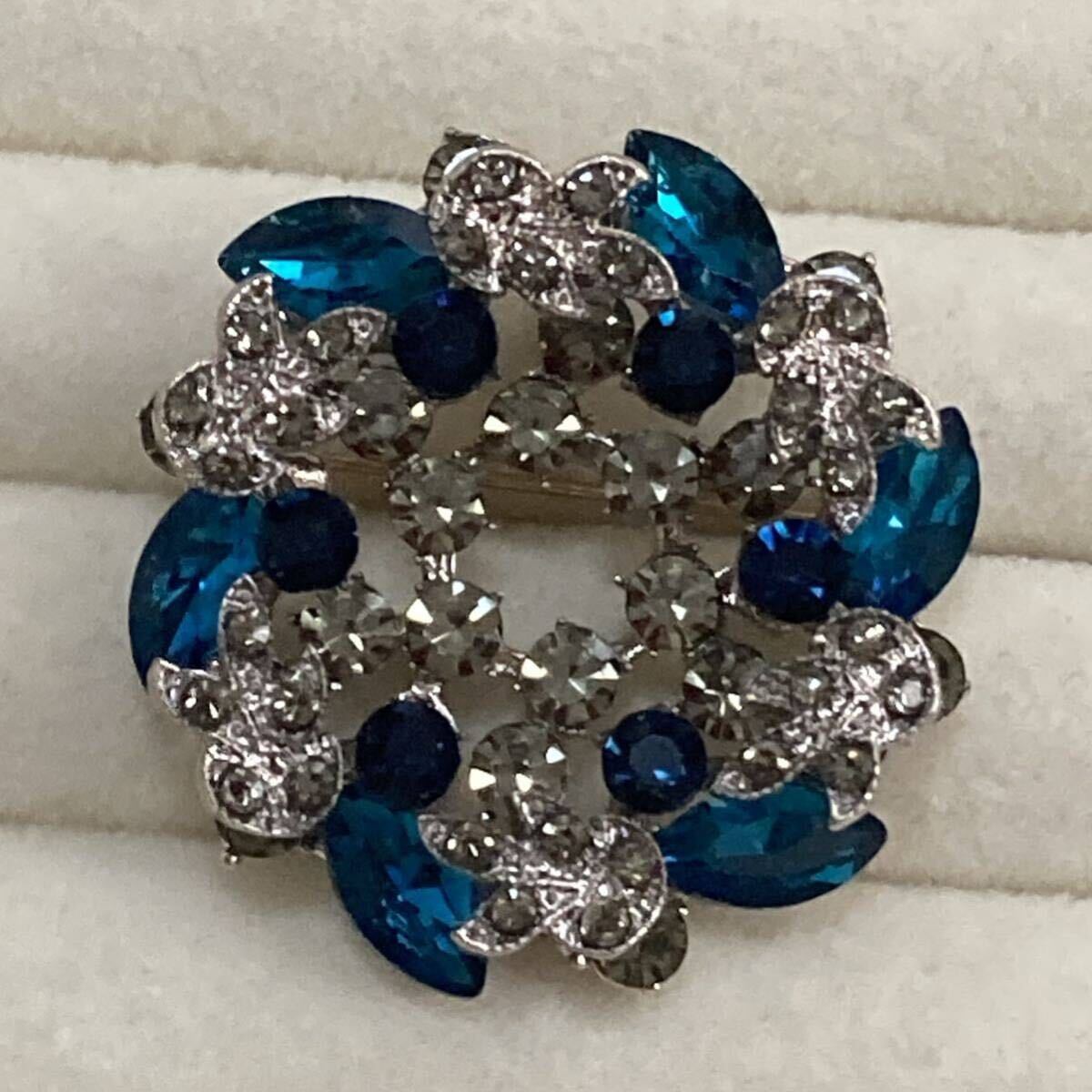 新品送料無料 青の綺麗なブローチ リース ラインストーン 輪 リング ラウンド 夏 サファイア色 アンティーク シルバー色 スカーフピン
