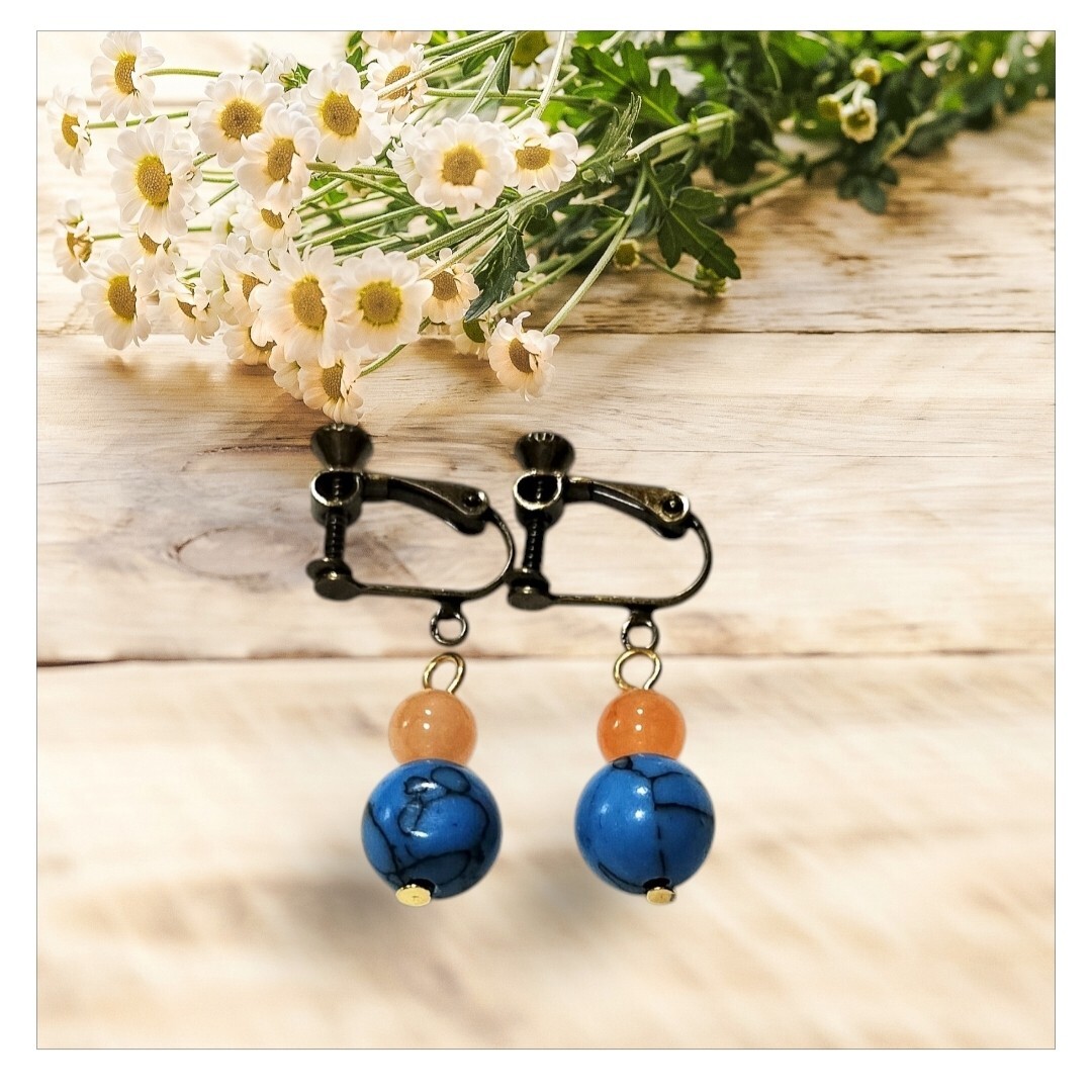 ターコイズとオレンジヒスイのビーズを使用したぶら下がり式イヤリング。