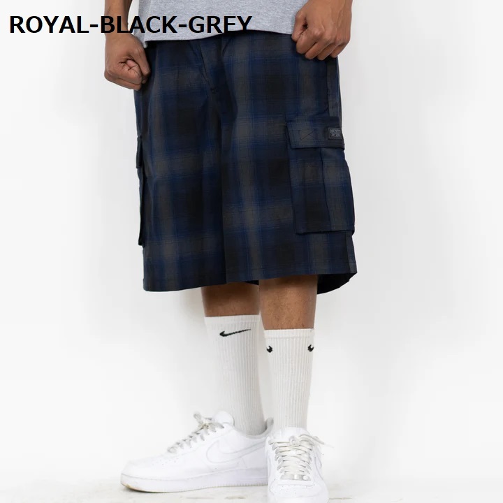 BJ97)FB COUNTY チェックカーゴハーフパンツ/XL/HIPHOP/B系/大きいサイズ/ウエッサイ/チカーノ/Royal-Black-Grey