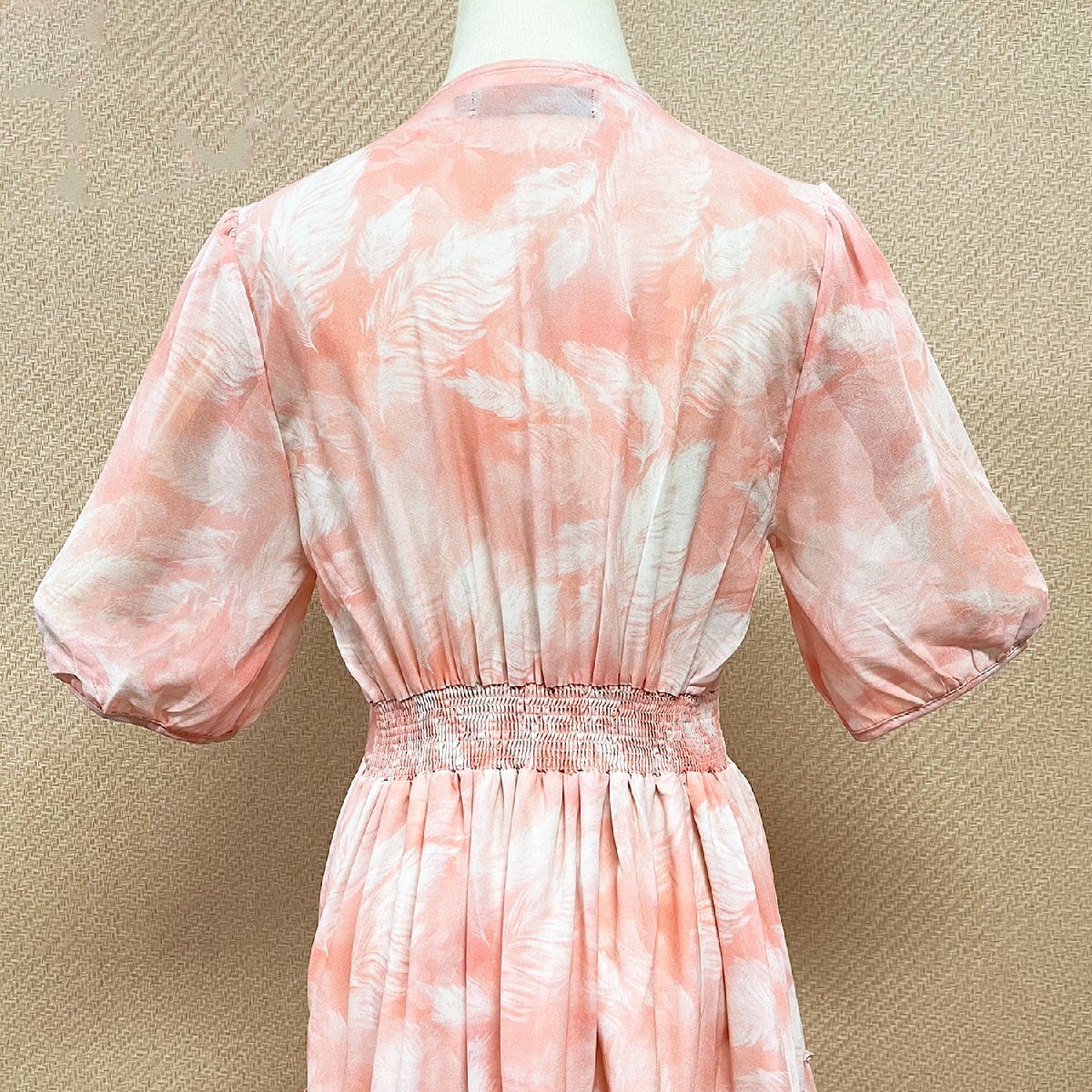 人気ヨーロッパ製※定価5万◆ブルガリア発※RISELIN ワンピース シルク混 薄手 通気 総柄 リーフ柄 Vネック 貝殻 可愛い レディース 夏 M/46サイズ