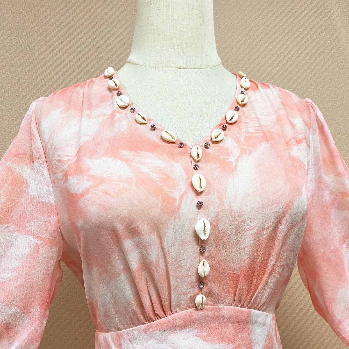 フロントには貝殻ビーズをあしらい、夏らしく爽やかでフェミニンな印象を演出します。細部に散りばめられたリーフ柄がオシャレ感満点のワンピースドレスです。Vネックでデコルテを綺麗に見せ、エレガントな雰囲気を演出します。ハイウエストデザインで脚長効果があり、シルエットもすっきりと美しく見せてくれます。