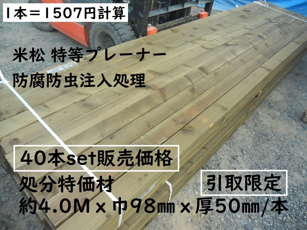 | 引き取り限定出品 発送対応不可 無くなり次第終了!スポット価格(2set有り) 米松 /防腐注入処理 約4mX約98mmX約50mm X40本 出品価格は40本分(バラ売り不可) 「消費税不要」 加圧防腐注入処理なので屋外の利用におすすめ!! ![]() | |