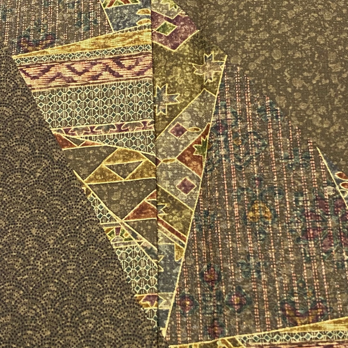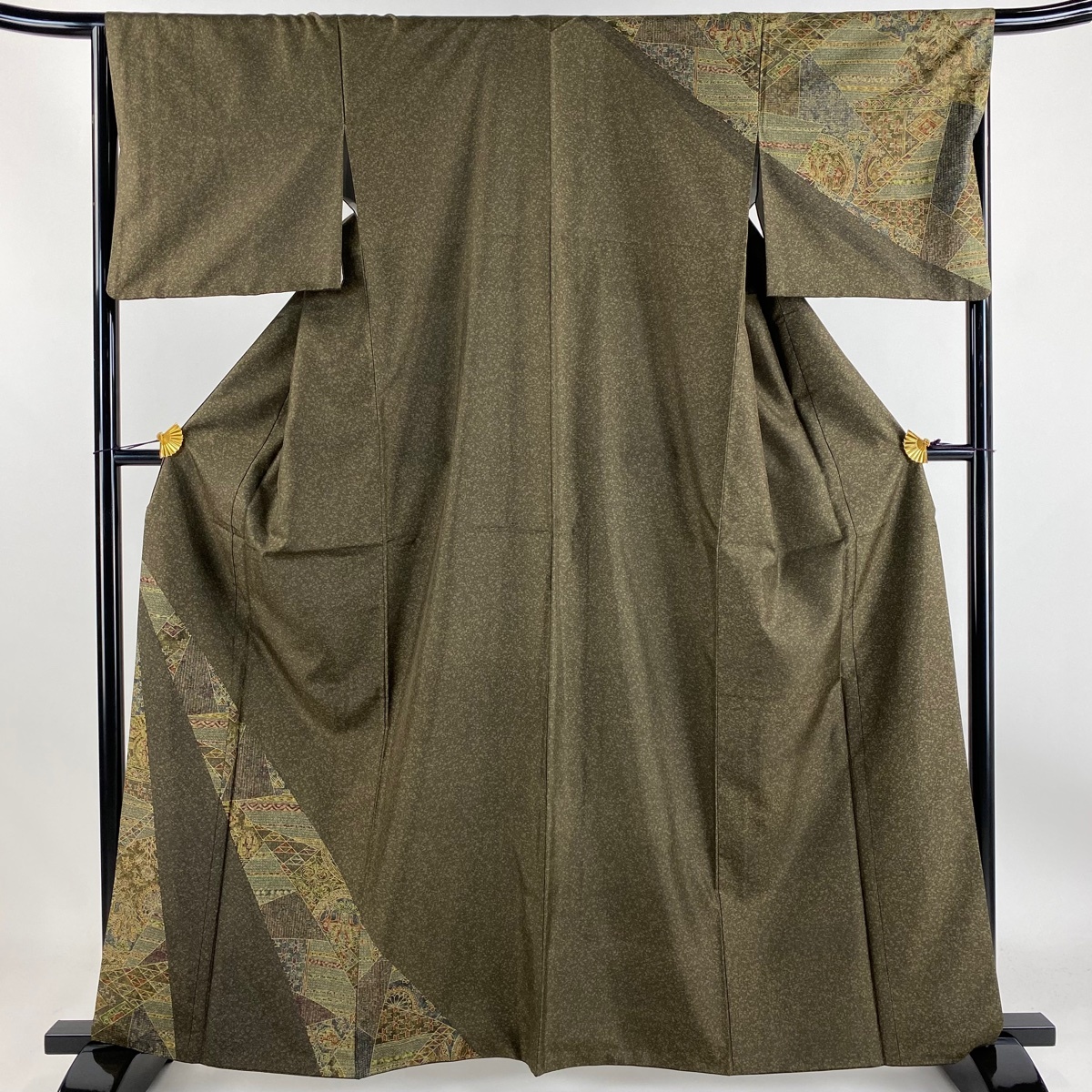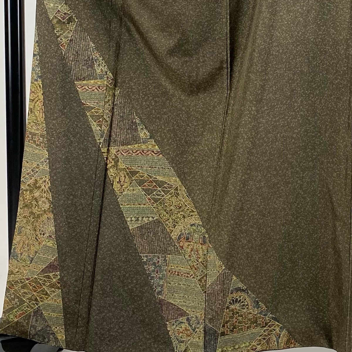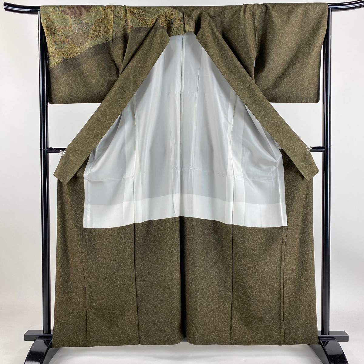 | 付下げ 美品 名品 紬地 花唐草 鱗文 茶緑色 袷 身丈161.5 裄丈66 M 正絹 【中古】 |