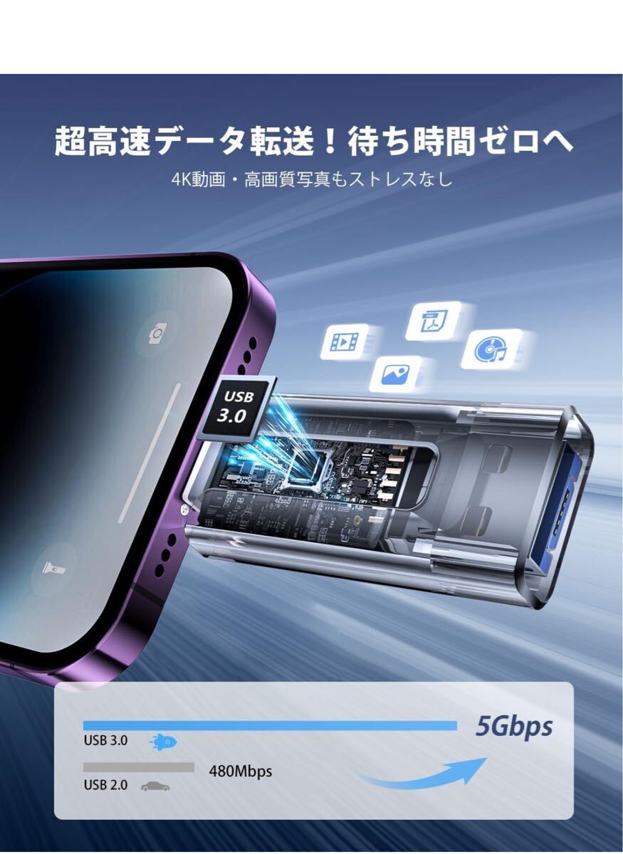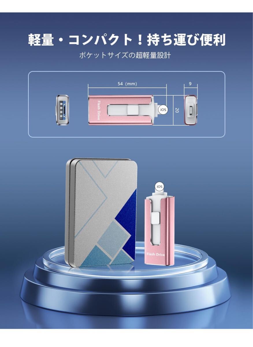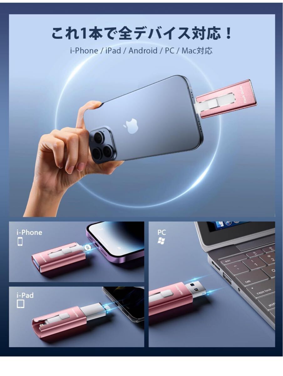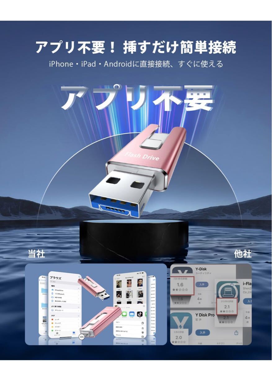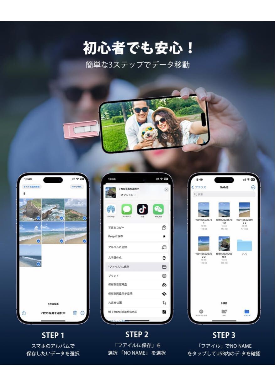 【アプリ不要!Phoneから直接usbメモリに写真保存できる神アイテム】このPhone対応usbメモリは、専用アプリ不要で、PhoneやiPad、Androidスマホ、Windows PC、Macに直接接続できるため、複雑な設定やネット環境がなくてもPhoneの写真や動画を即座に保存できます。操作も「接続→選択→保存」の簡単3ステップで、機械に不慣れな方でも使いやすいです。Phoneてテータ保存usbとして、iCloudに頼らずに旅先や日常の思い出をスマートにバックアップできる便利なスマホusbメモリです。