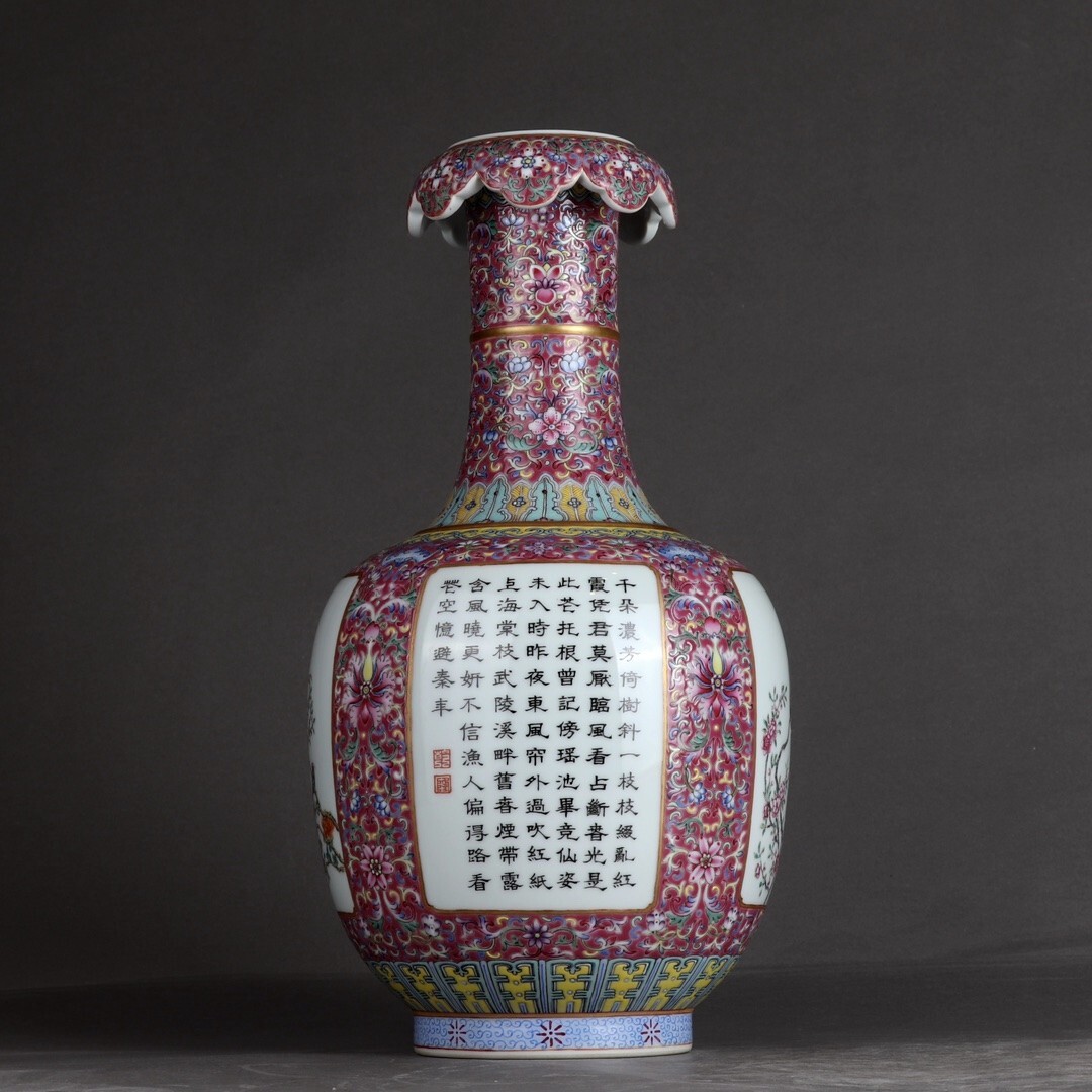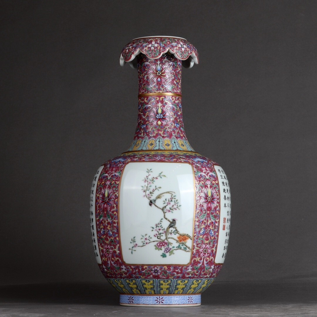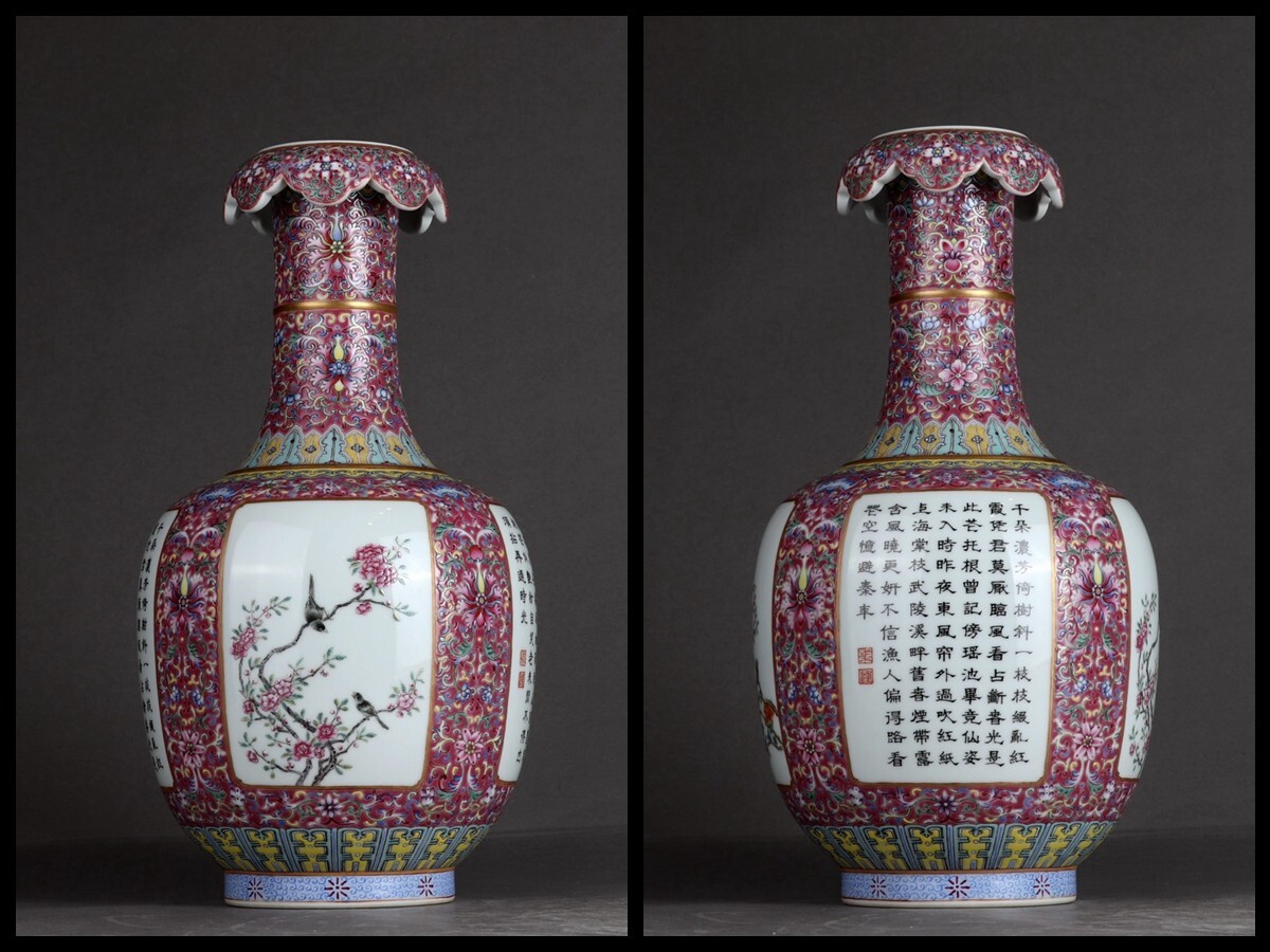 「清 乾隆年製 陶磁器 粉彩描金臙脂紅地纏枝蓮 開窗花鳥詩文 花口瓶」染付 置物 擺件 古賞物 中国古美術 旧蔵出