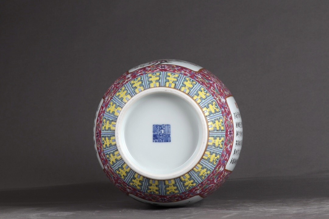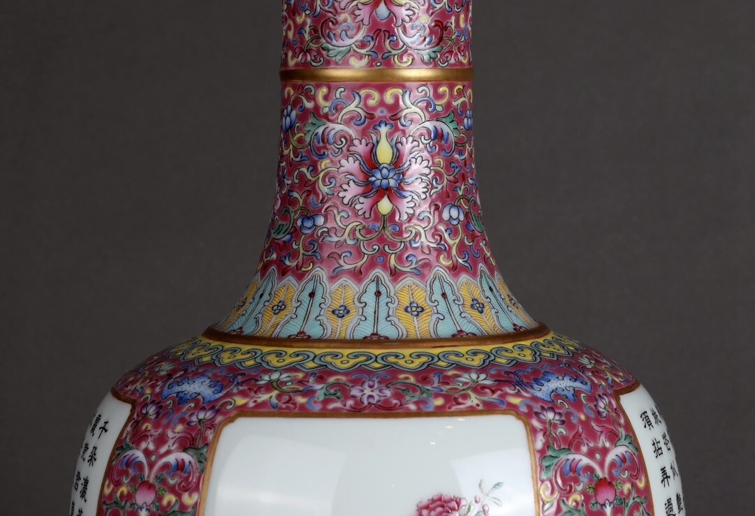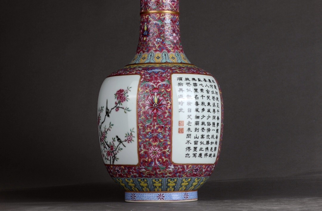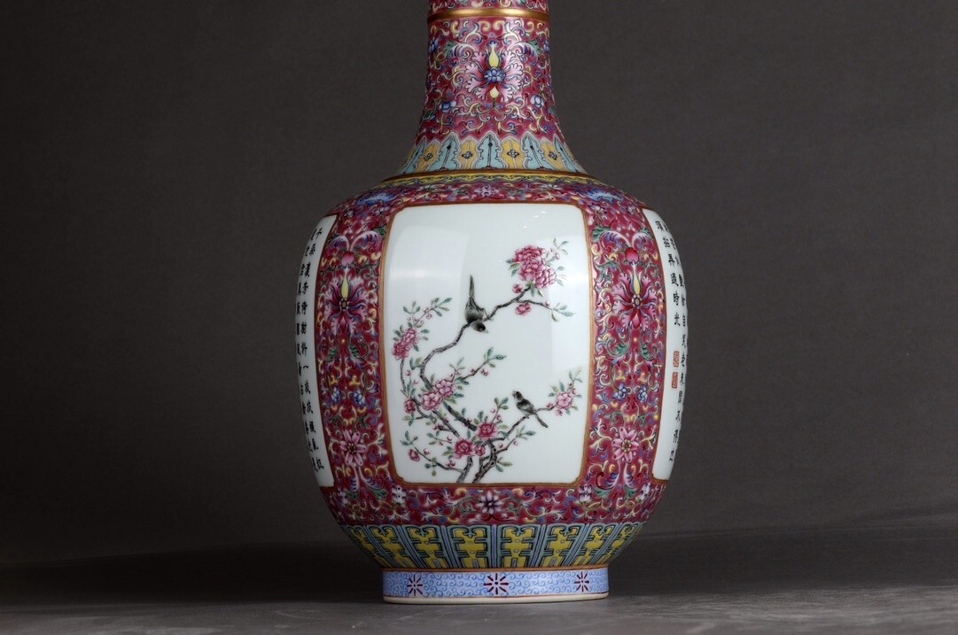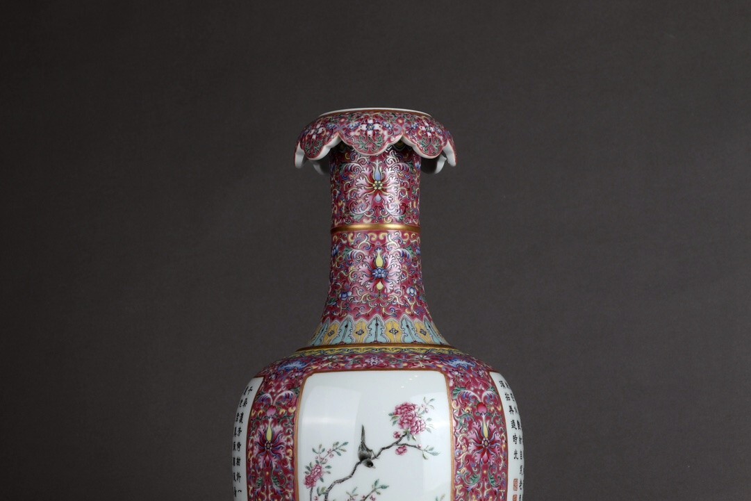 「清 乾隆年製 陶磁器 粉彩描金臙脂紅地纏枝蓮 開窗花鳥詩文 花口瓶」染付 置物 擺件 古賞物 中国古美術 旧蔵出