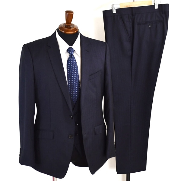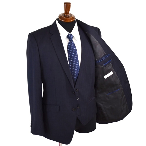 ・春秋対応。ベスト付き。2つボタンシングル。袖口3つ釦開き見せ。総裏地仕上げ。センターベント。フラップポケット。ネーム刺繍なし。