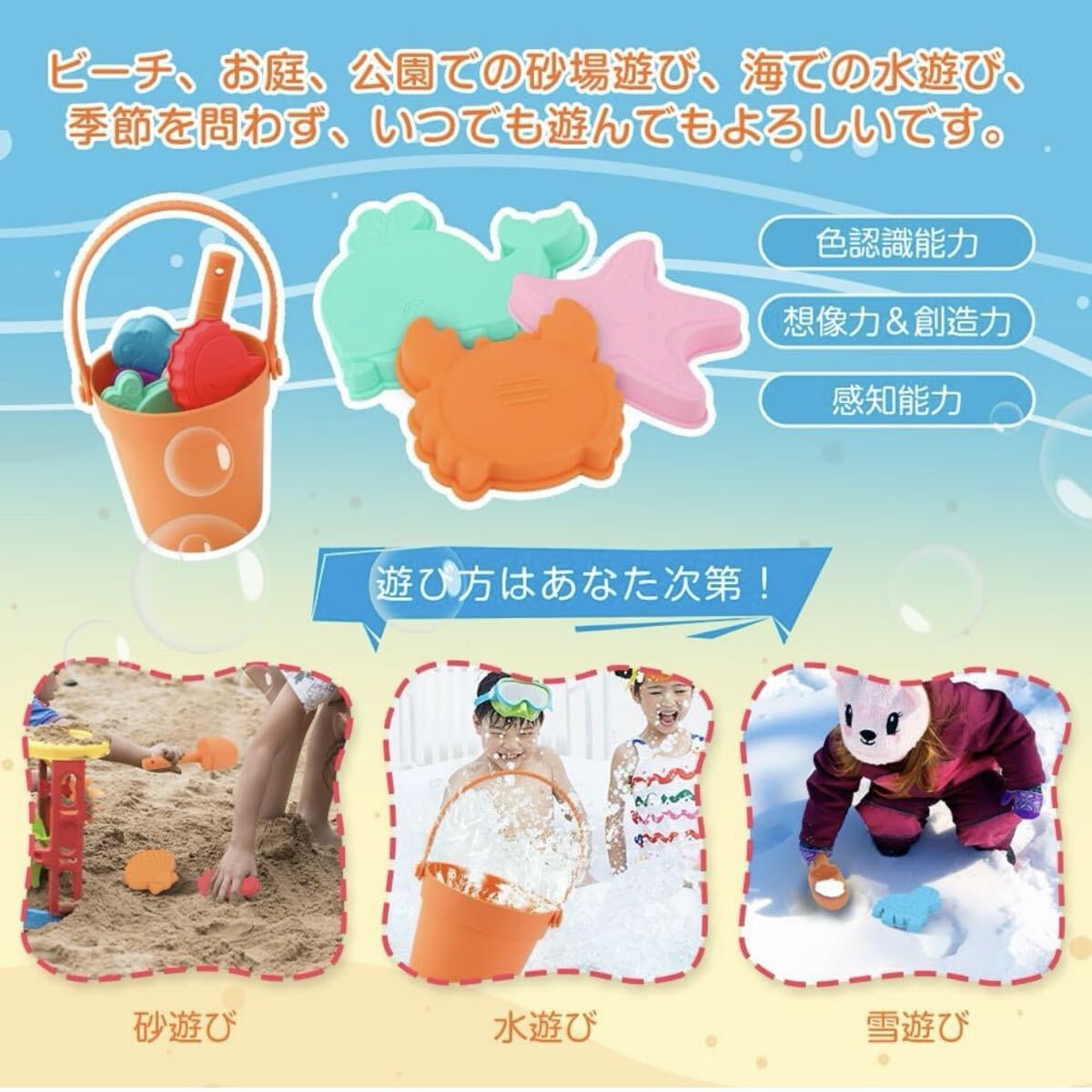 カニ、ヒトデ、クジラ、タツノオトシゴなど、さまざまなかわいい型が揃っています。 これらのさまざまなデザインは、子供たちの興味を引き付け、想像力と創造性を刺激し、もっと楽しくなります