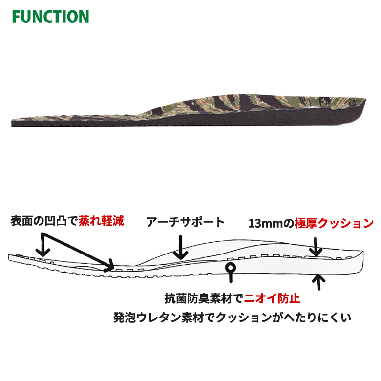 インソール 中敷 臭わない 臭い ニオイ抑える 抗菌 消臭 蒸れにくい ムレにくい 通気性 ブラック 疲れにくい クッション 香料 厚い 厚み 快適 清潔 迷彩 カモフラージュ カーキ