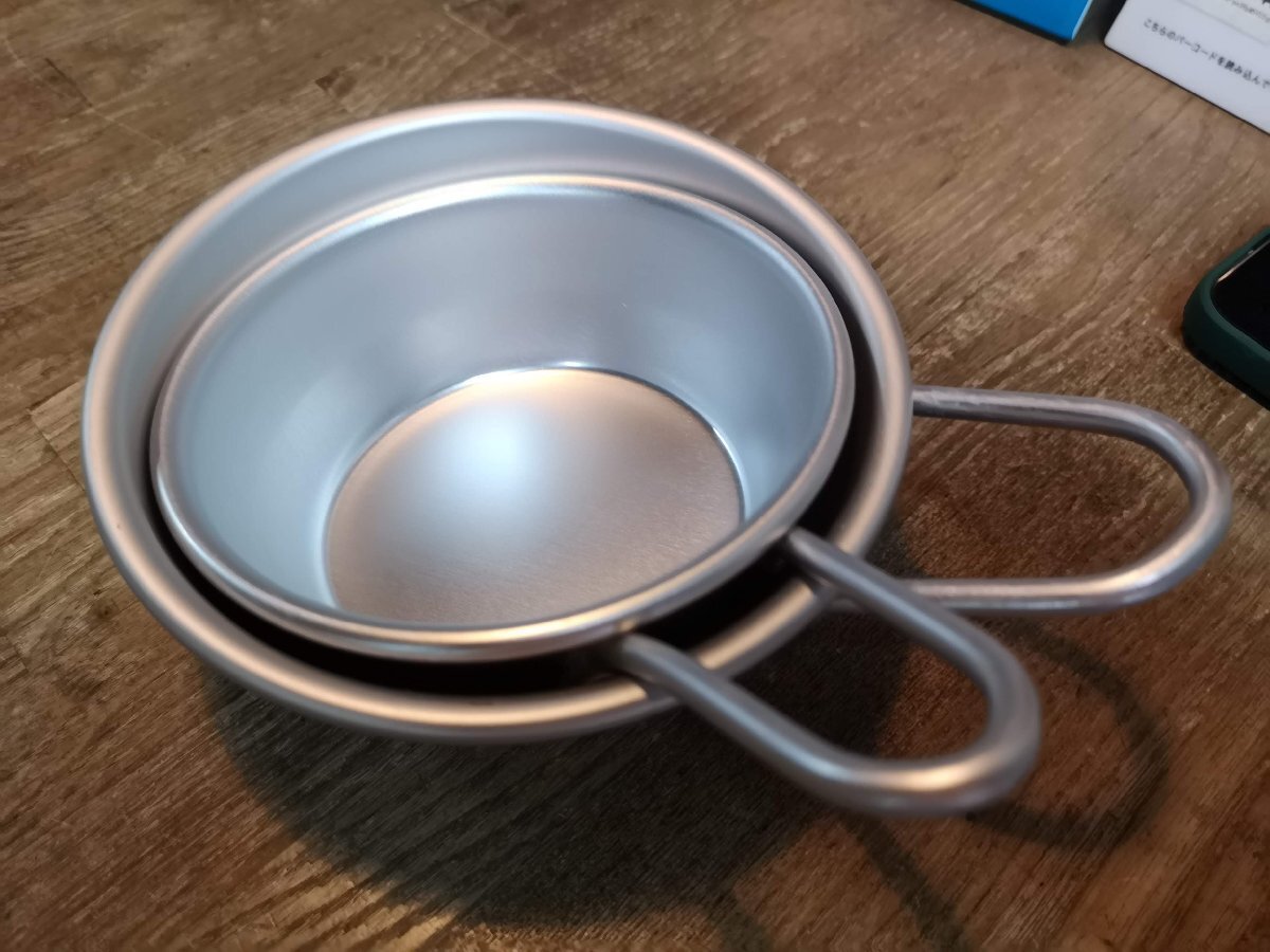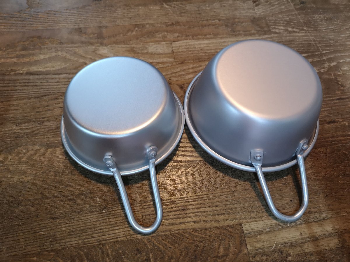 出品はサイズの小さなほうです。サイズは高さが4.5cm上部の直径12センチ程度のアルミカップ。シンプルでいながらちょいと気の利いたデザインは家庭でもキャンプにと活躍する場は多いです。沖縄離島を除く全国元払い500円にてお送りいたします。落札価格にプラスでお願いいたします。