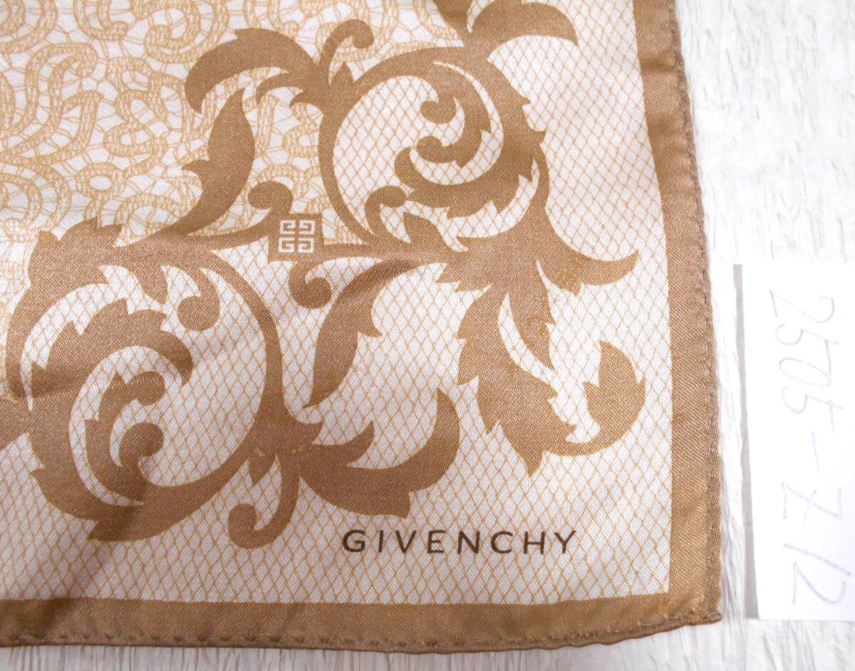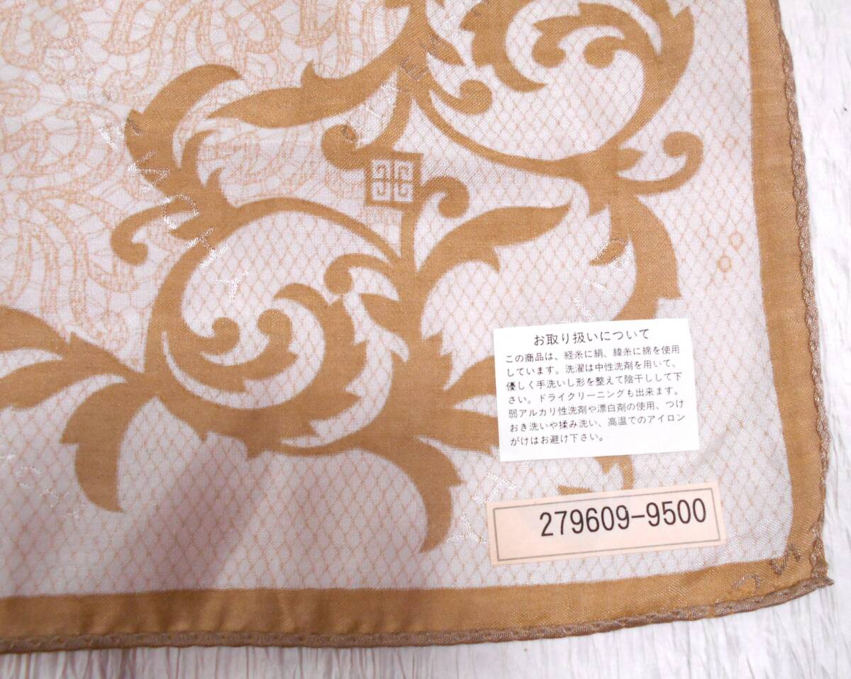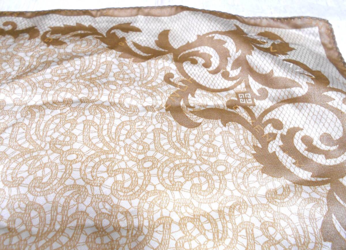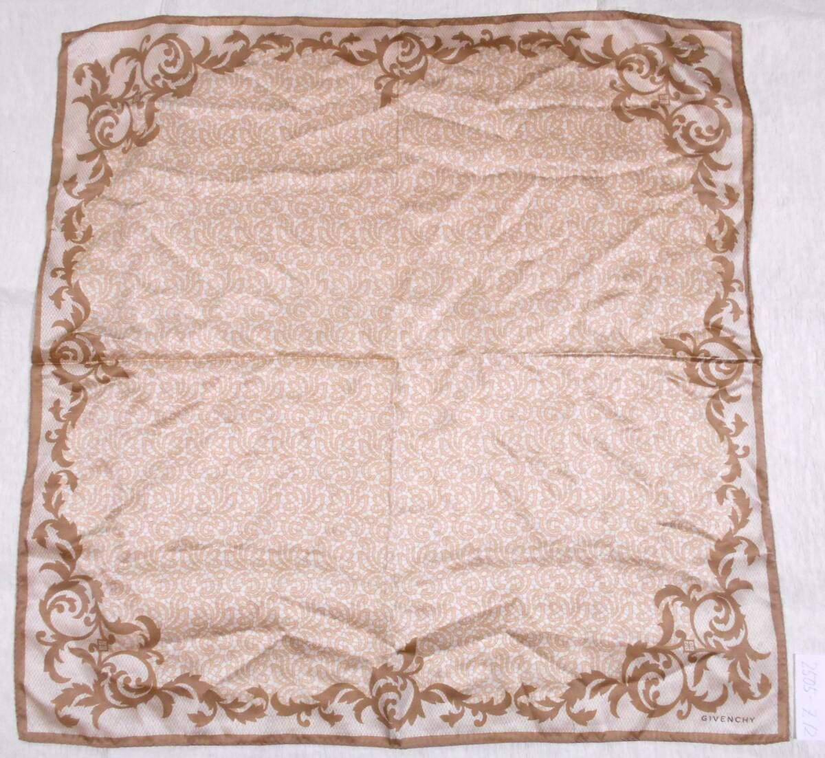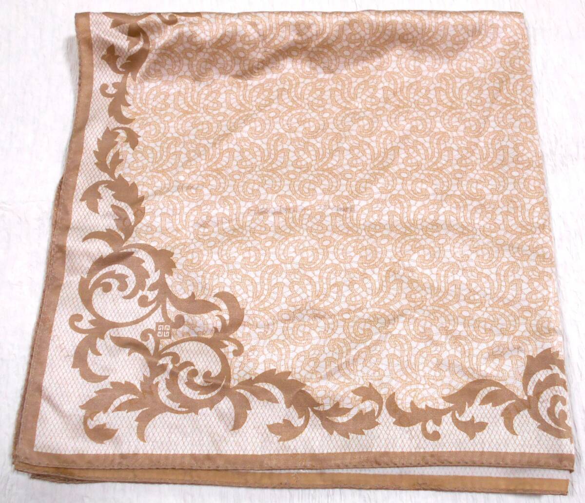 ベージュ地に渋い薄茶で蔓模様のミニスカーフです。