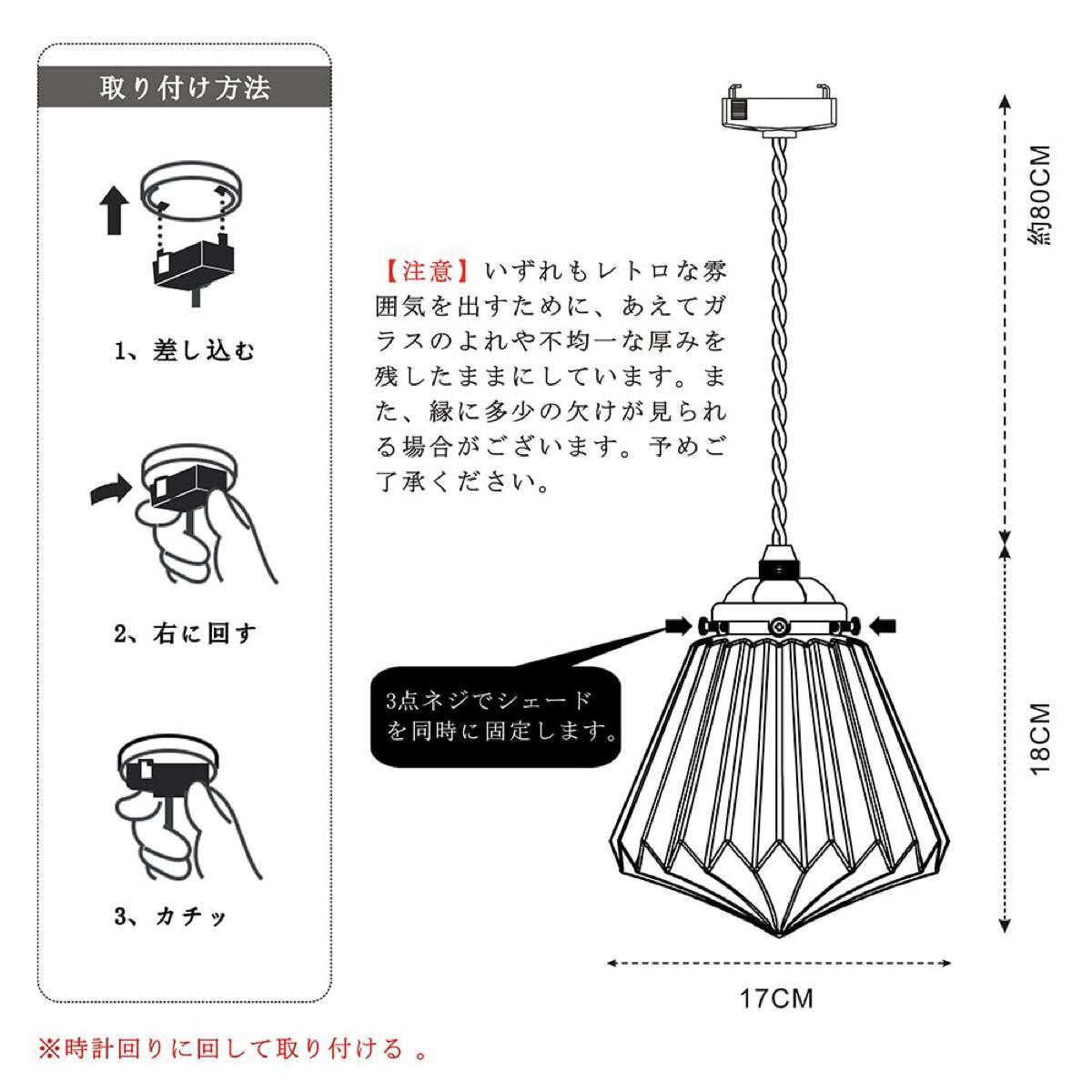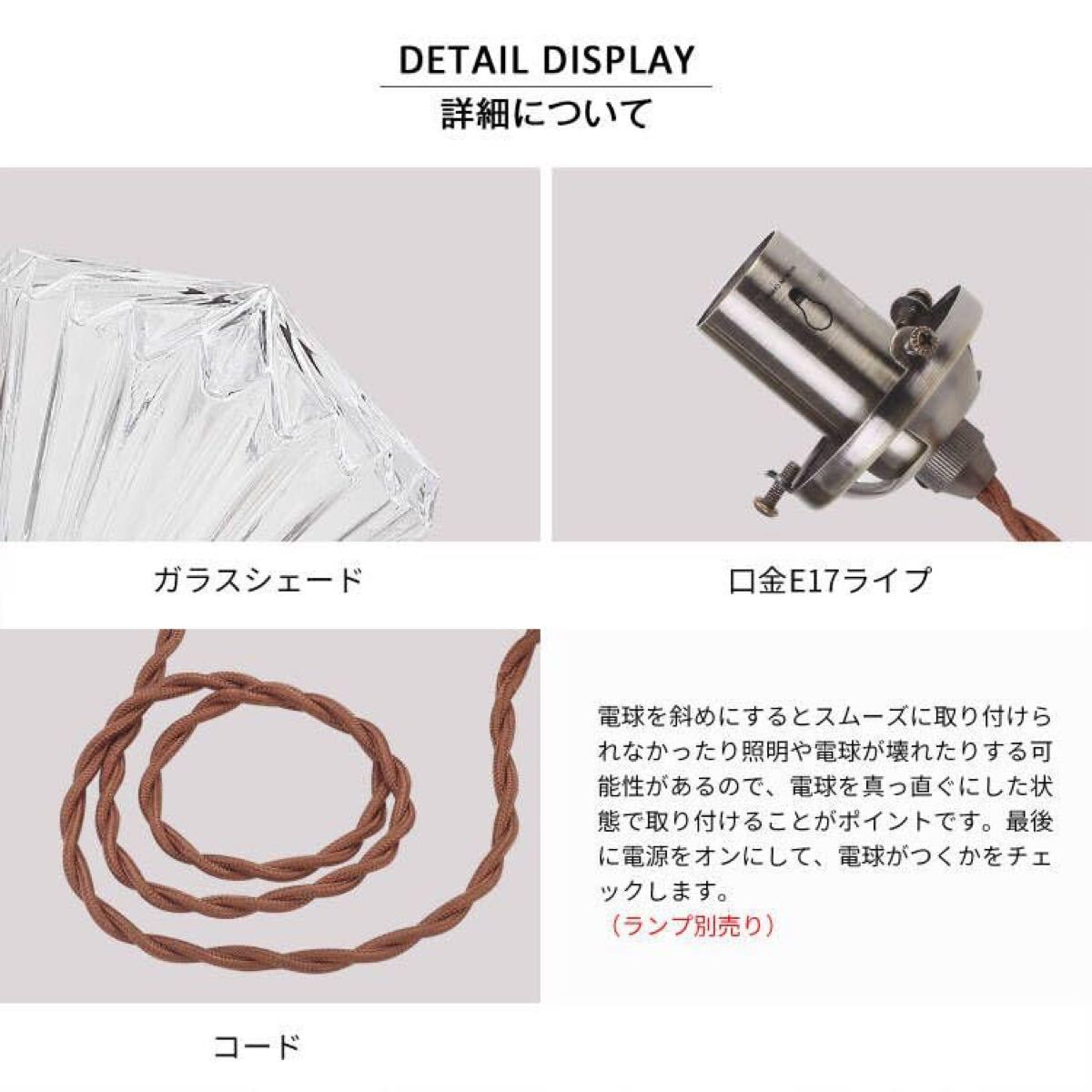 シェードサイズ:直径170*高さ180mm シーリングカバー:なし コード長:800mm 全高:約818mm 重量:約920g 素材:ガラス、アイロン カラー:クリアとブロンズ 対応電球タイプ:蝋燭型 C35 シャンデリア電球(口金E17 直径35mm 長さ93mm) 備考:LED対応、※こちらの商品には電球は付属しておりません。 消費電力:MAX.60W 定格電圧:100V 取り付け方法:引掛シーリング式(シーリングカバーなし) 安全規格:安心の日本PSE規格準拠 届出事業者名:有限会社ビーンズ