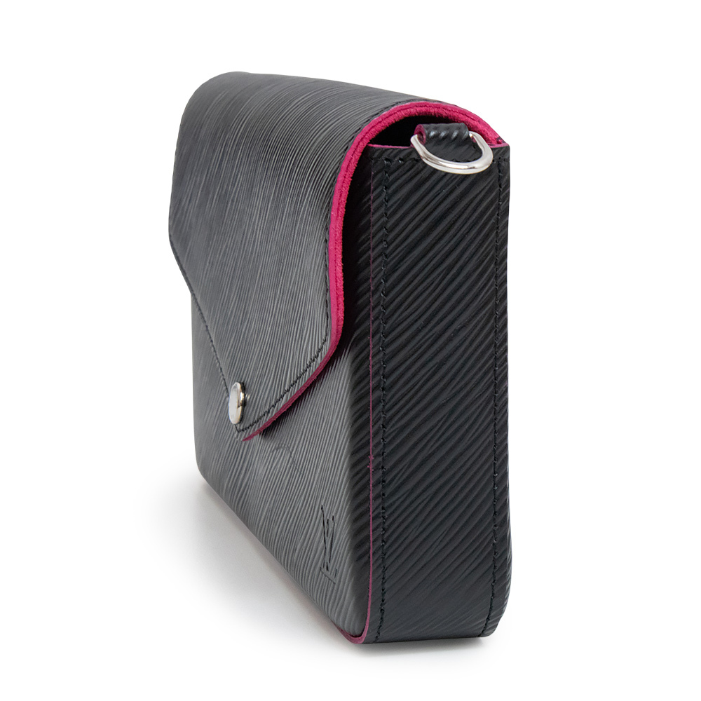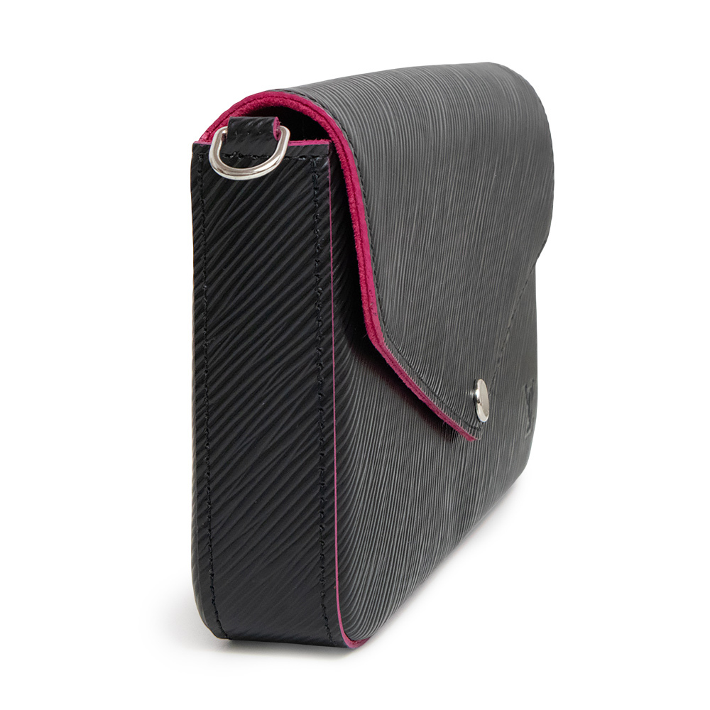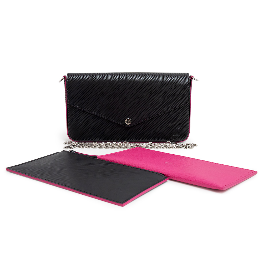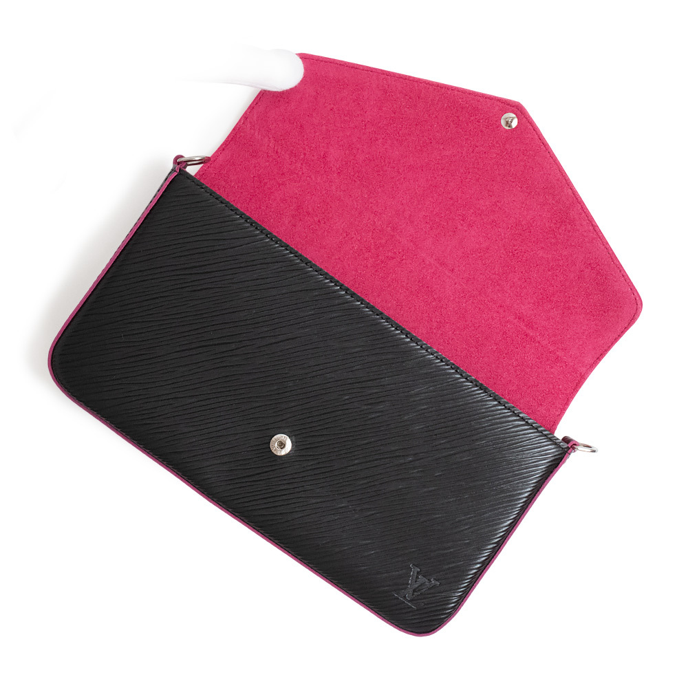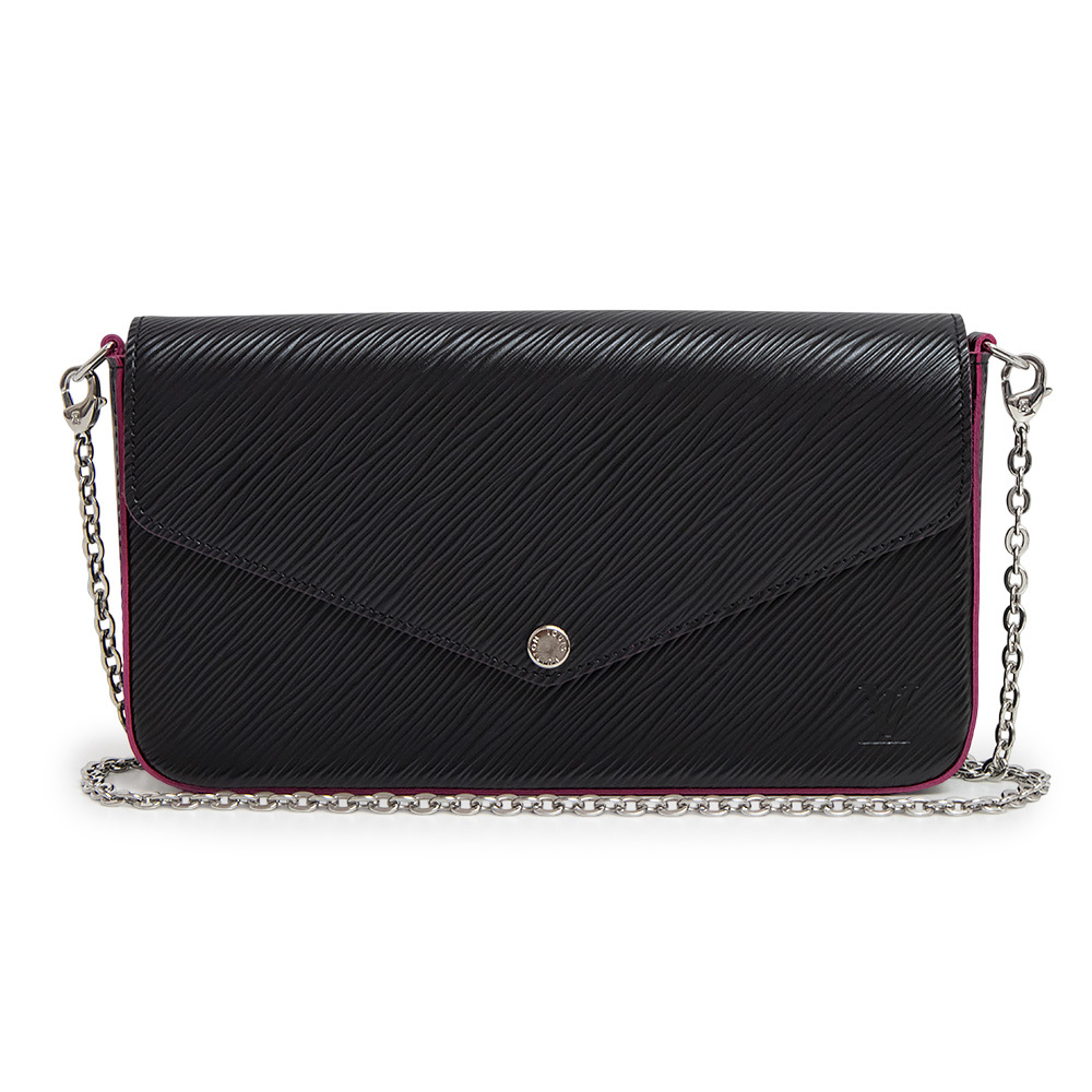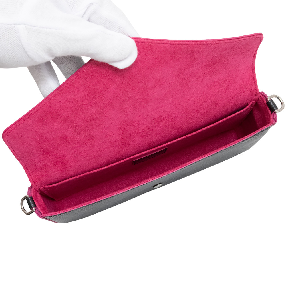エレガントなブラックレザーに鮮やかなホットピンクの縁取りを施した、「ポシェット・フェリシー」。エンヴェロップ型のポーチに、大容量のコンパートメントと2つの取外し可能なポケットあり。この上なくフェミニンな印象で、機能性にも優れたスタイリッシュなポシェットです。