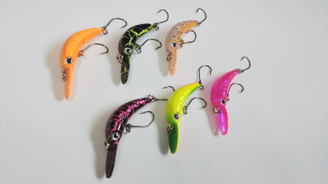 スローなリーリングで強めのアクションをする、ニョロ系クランク6色セットです。