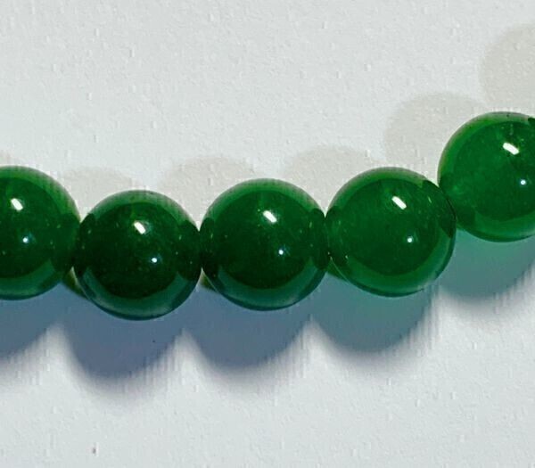 台湾では青玉と言いますが実際には濃い緑色です。昔は緑を青と呼んでいたのは、台湾も日本と同じようです。この深く光沢のある翠(みどり)色には、心を深い部分から癒してくれるパワーがあります。8ミリ珠を約54個使用。贅沢な総天然石ネックレスです。全長44センチ。