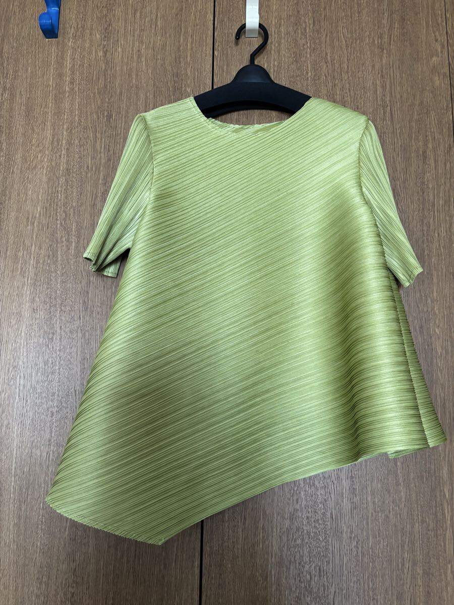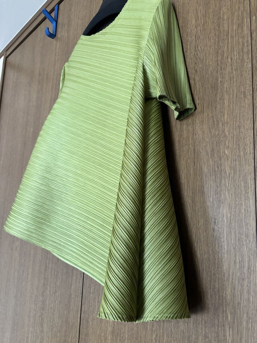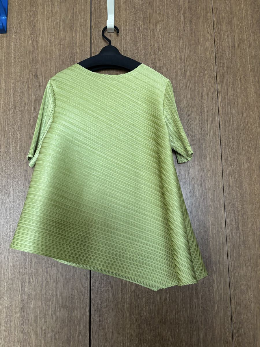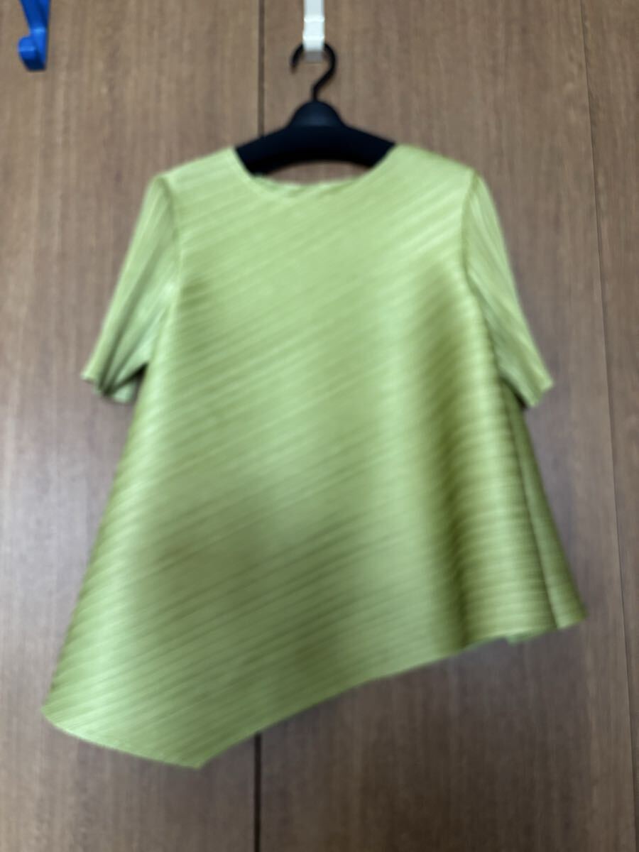 サイズ・着丈59-66cm・胸幅50cm・肩幅38cm・袖丈28cm・横にPLEATS 半袖トップス・歩くたびに上下揺られで・可愛いです・透け感なし・生地とても良い・中厚手・日本製・作りが良い・色は明るくおしゃれクリーン・