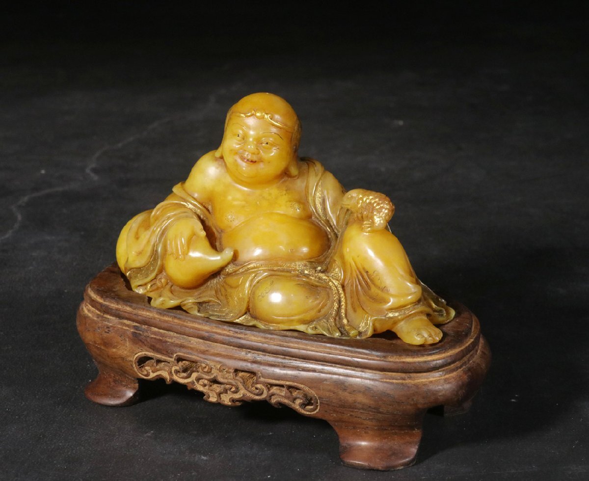 【安】清時代 尚均銘 寿山田黄石彫 劉海戯金蟾造像 台座付き 共箱 極細工 古置物 古擺件 中国古美術 古美味 時代物 311 サイズ(約寸) |