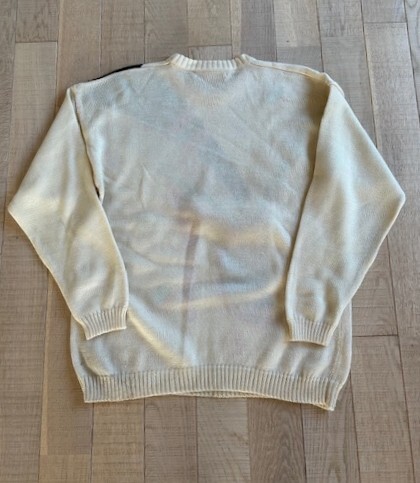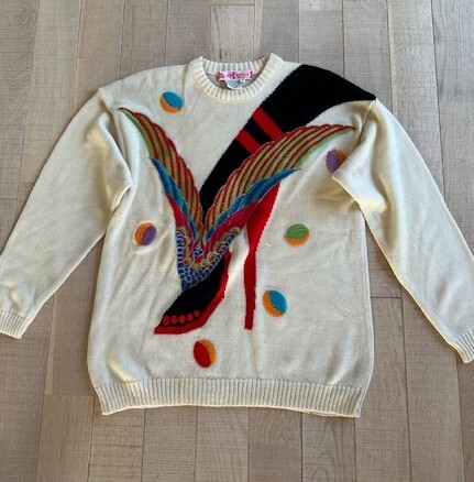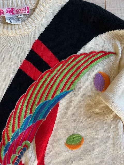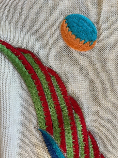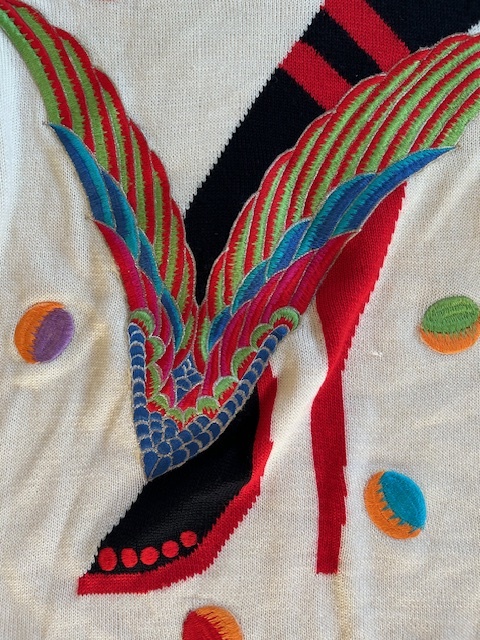 ニットはインターシャで靴と脚を描き、さらに刺繍で羽やドットを描いています。