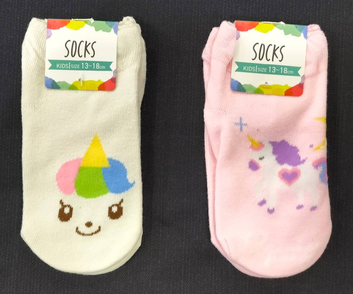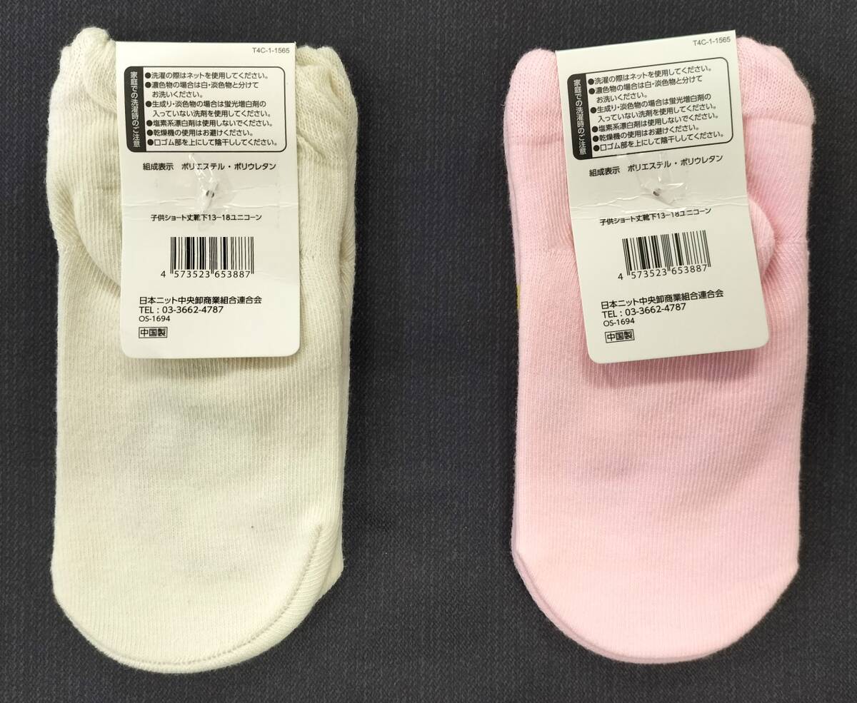 ①メーカー不明 子供用ショート丈靴下×2 ピンク・ベージュ・ユニコーン柄 13-18cm