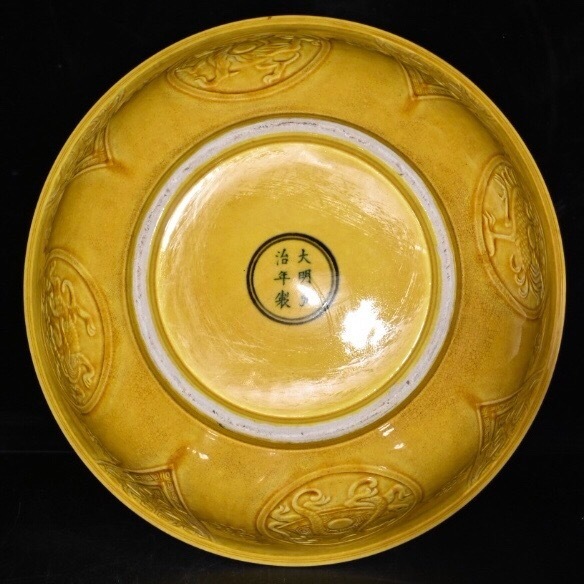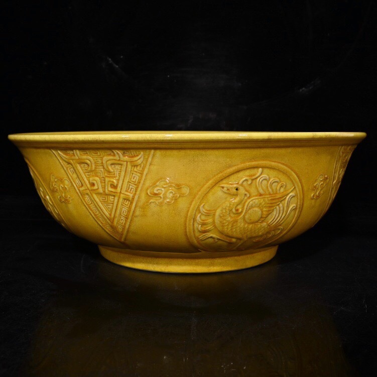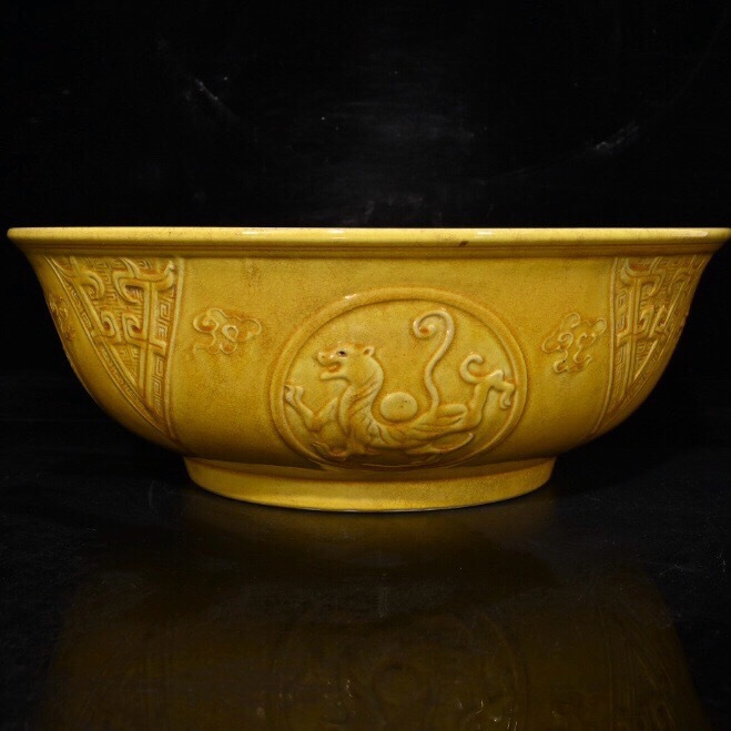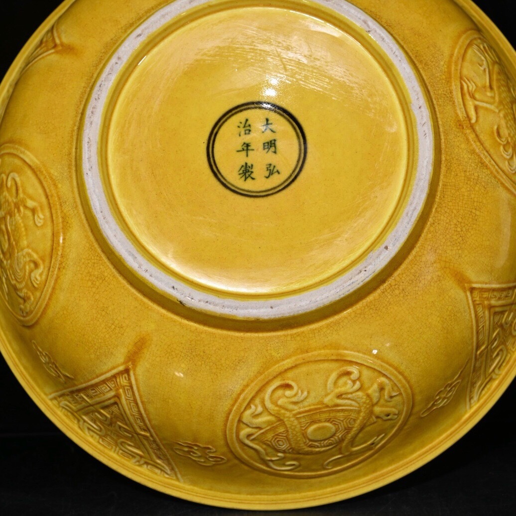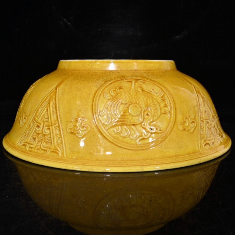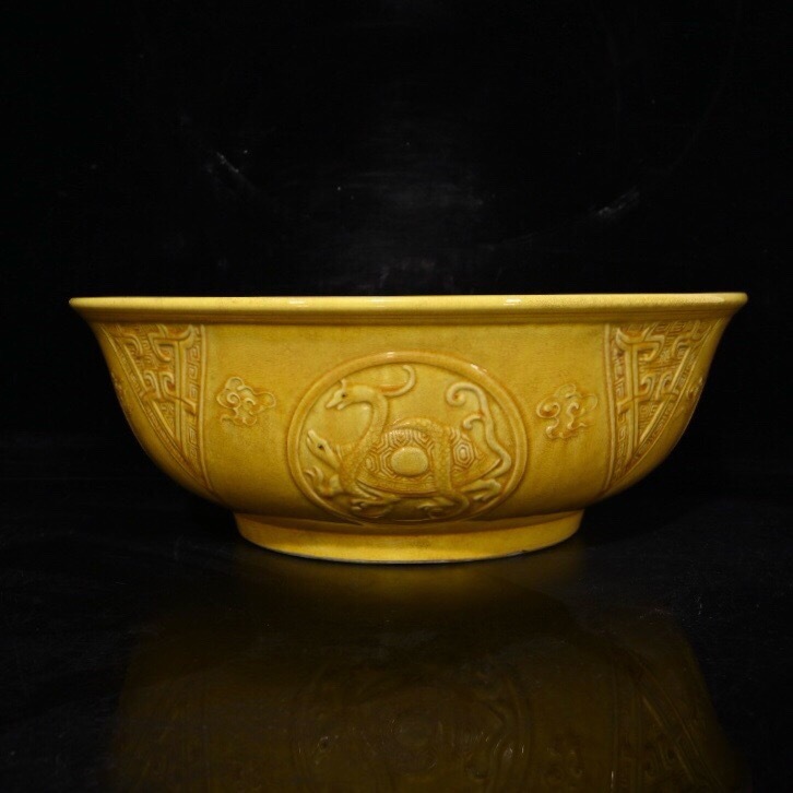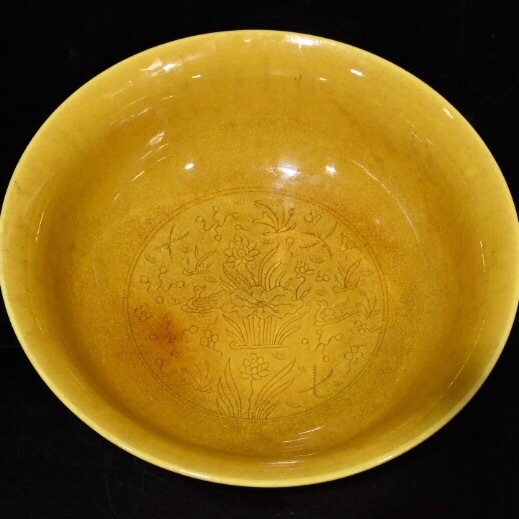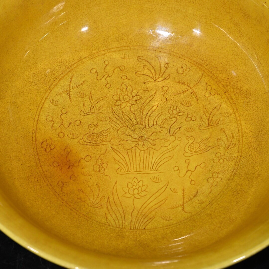 | 【蔵友館蔵品・明・弘治年製款・古陶瓷品・黄釉・開片・鴛鴦戲水紋・供碗・陶藝】・古董品・中国古玩・時代物・希少珍品・中国時代美術 |