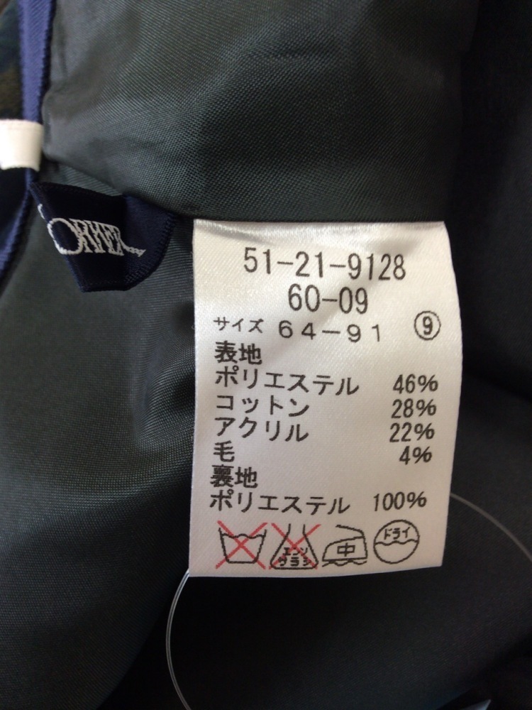 このお品は春向けです。 表示サイズ9、64-91 表地はポリエステル46%、コットン28%、アクリル22%、毛4% 裏地はポリエステル |