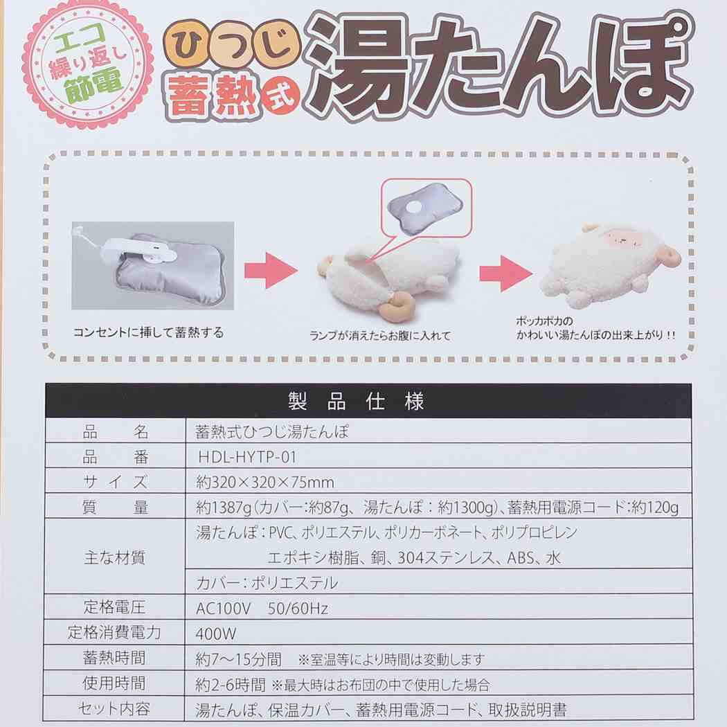 繰り返し使えてエコなあったか湯たんぽ 寒い冬もあったかく過ごせるウォーマー雑貨シリーズこちらはかわいい[蓄熱式湯たんぽ]コンセントに挿して蓄熱するだけでポッカポカのかわいい湯たんぽの出来上がり蓄熱時間約7-15分間で約2-6時間あたたかさが継続します1日1回の蓄熱電気代約2円(1kwh単価27円で算出)毎日使っても1ヶ月わずか60円繰り返し使えるのでエコ節電自分用はもちろんプレゼントやギフトにも最適かわいいあったかグッズいろいろあるのでお気に入りをみつけてくださいサイズ:約320x320x75mm定格電圧:AC100V 50/60Hz定格消費電力:400W使用時間:最大約2-6時間(最大時はお布団の中で使用の場合)蓄熱時間:約7-15分(室温等により時間は変動します)
