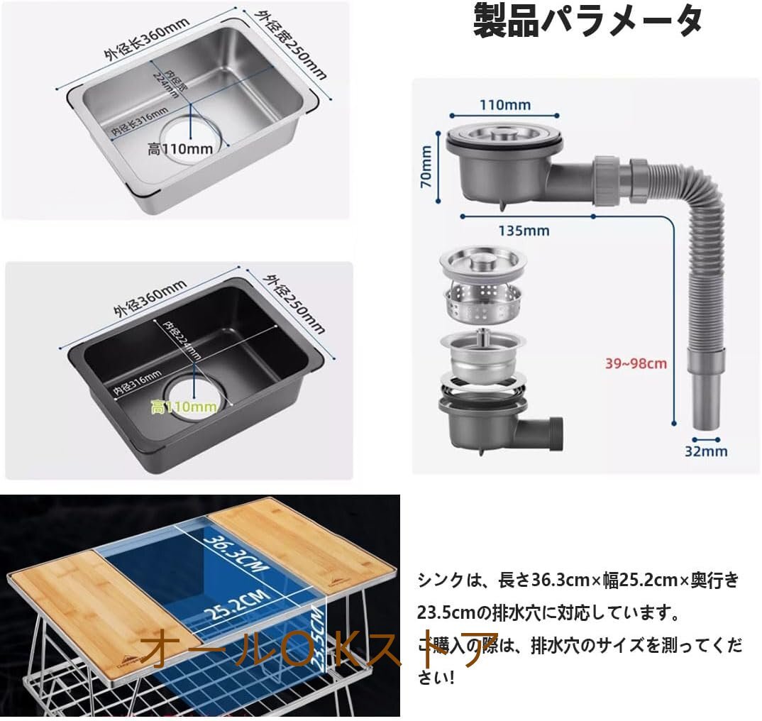 キャンピングカー シンク 流し台 簡易シンク ステンレス製 排水ホース付き 野菜洗浄 浸漬両用 錆びず 防汚 耐腐食性 簡単取付 DIYに最適