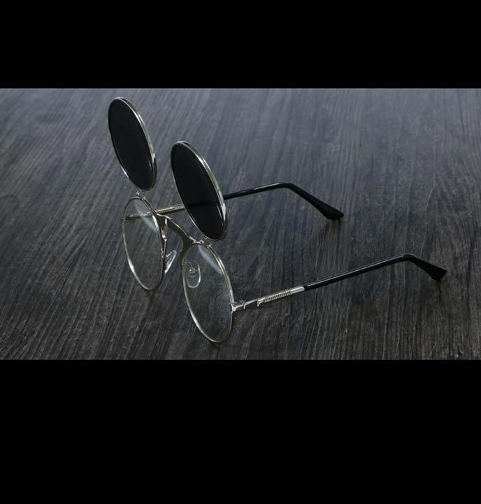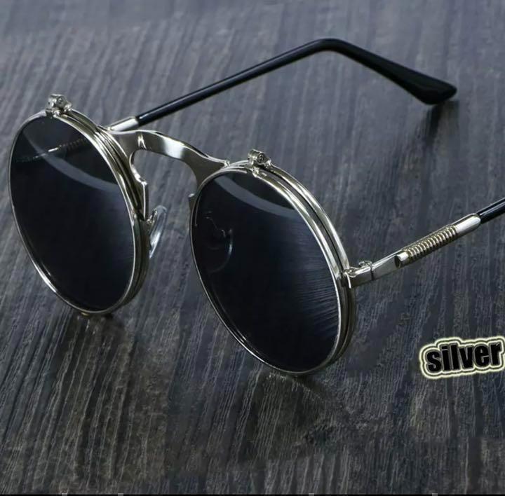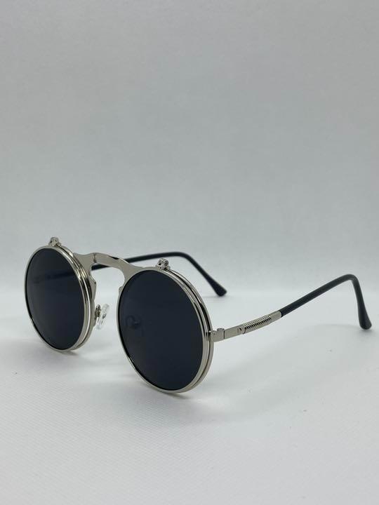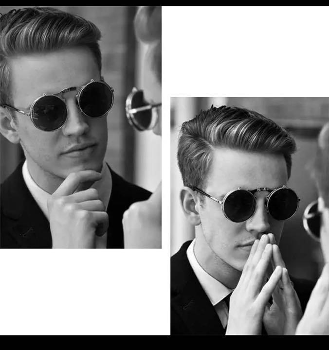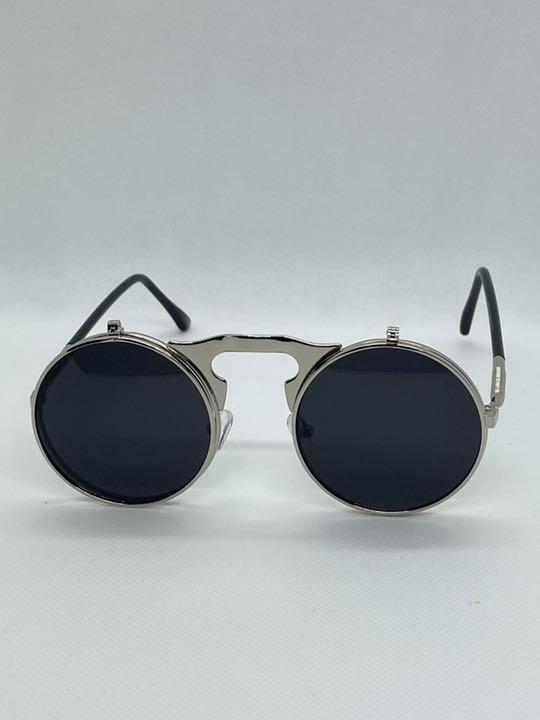 レンズが跳ね上げ式になっているオシャレな丸型サングラス です。ユニセックスなデザインでファッションのアクセントに活用できるアイテムです。
