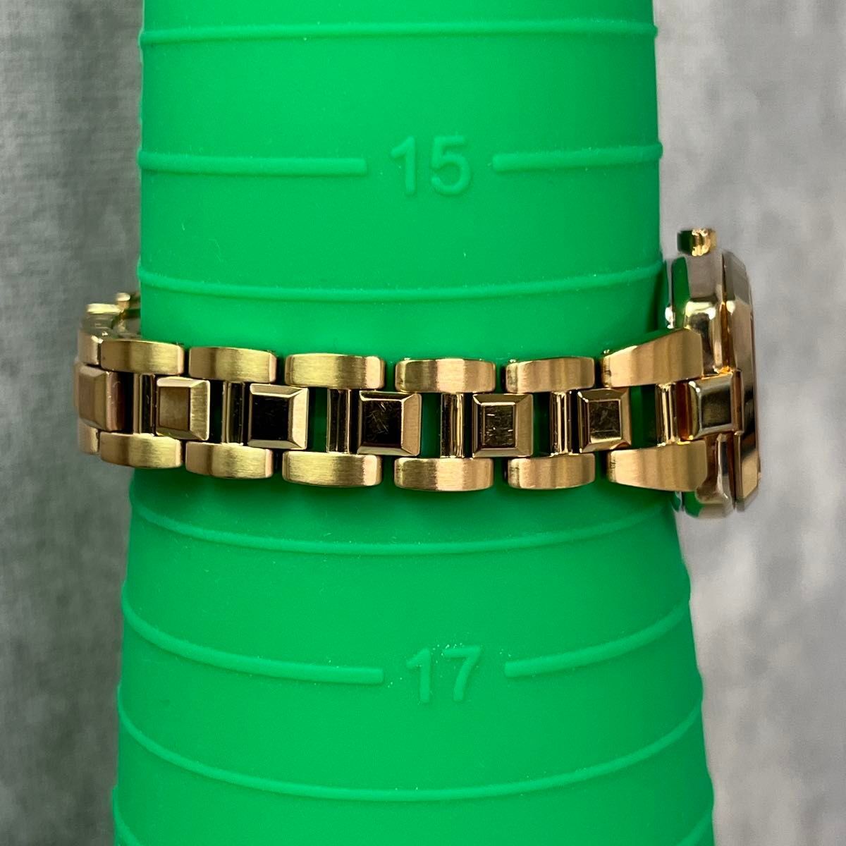 セイコー ルキア SSVW128、女性に人気の高い電波ソーラーモデルです。ケースは上品なトノー型で、ゴールドカラーが華やかさを引き立てます。文字盤にはダイヤがセッティングされ、黒地に映える立体的な装飾が高級感を演出。電波時計のため、正確な時刻を自動で受信し、日常的に時刻合わせを行う必要がありません。ソーラー充電方式を採用しており、光があれば稼働するため、電池交換の手間も不要。さらに10気圧防水仕様で、普段使いにも安心して着用できます。オンオフ問わず幅広いシーンで活躍するデザインと機能性を兼ね備えたモデルです。長く愛用できる実用性と華やかさを両立した一本となっています。