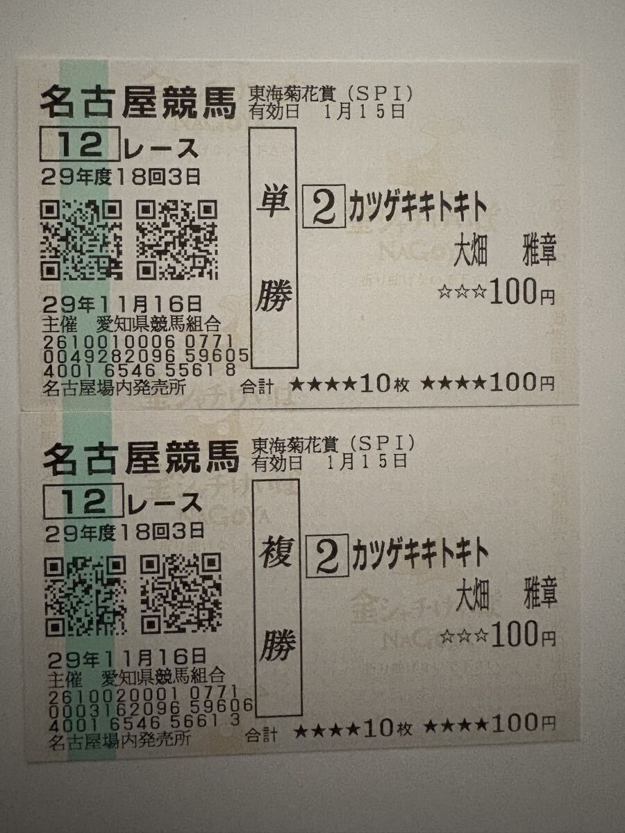 平成29年11月16日に名古屋競馬場で開催された 東海菊花賞 カツゲキキトキト 現地単勝馬券&複勝馬券 計2枚 です。